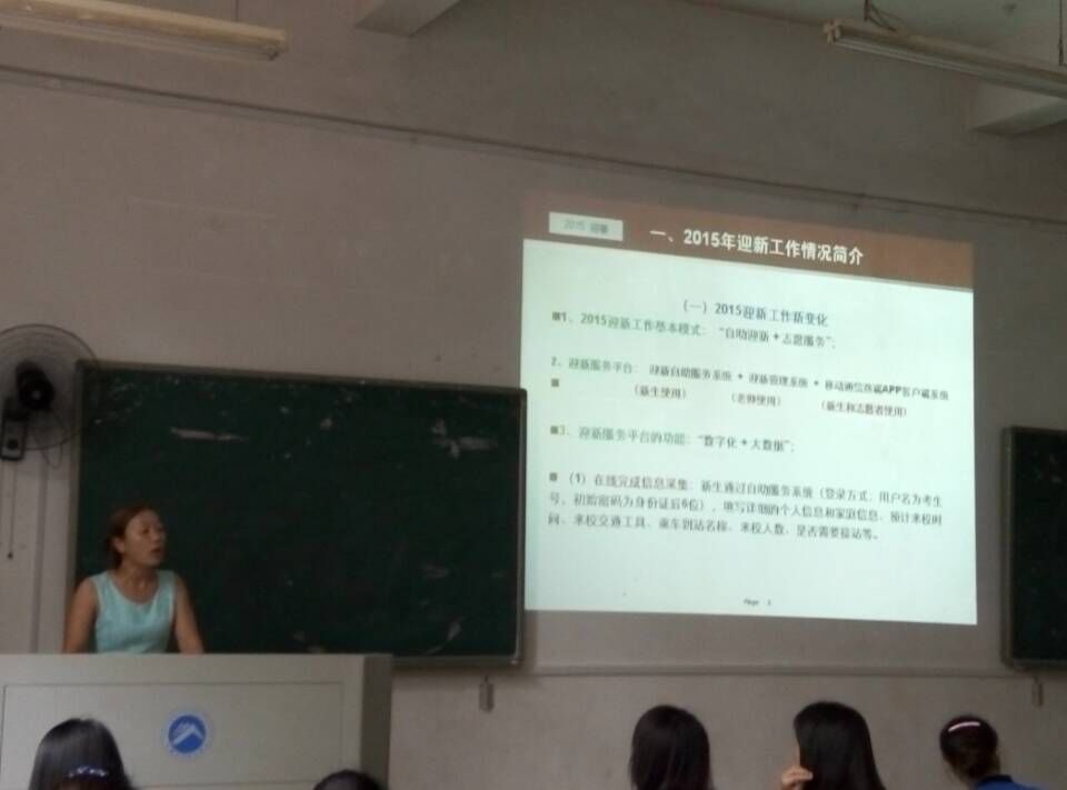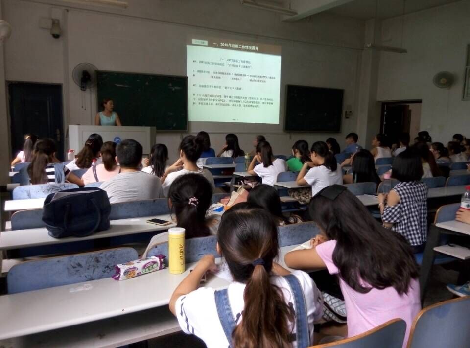 主讲本次培训会的是尹琼芳老师,同时她也将担任2015级新生的辅导员,会议伊始,尹老师从三个方面讲述进行了此次培训。首先,尹老师介绍了2015年迎新工作的新变化,2015迎新工作基本采用了 “自助迎新 + 志愿服务”的模式,新生可以自助选择寝室和床位、自助选择军训服装和卧具、在线自助缴费,这不仅让新生“提前知晓自己的新家”、“省事省心”也“轻松安全”,不仅带给给新生更大的便利,也给了公司迎新工作更大的自主性。另外,尹老师通知了大家迎新的时间地点等,迎新期间可能会遇上一定的困难,但是她希望大家克服困难,坚持下去。紧接着,尹老师讲述了对迎新志愿者的一些工作要求,这些要求大到对心理素质、纪律规范的要求,小到手机保持通畅、外表形象衣着等,正是这些大大小小的方面,体现出了尹老师对迎新工作的用心与耐心。尹老师耐心的讲,大家用心的听,共同将迎新工作准备好。