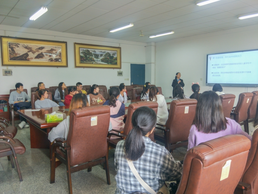“脚踏实地,仰望星空”。邹慧从大学职能和个人兴趣两方面展开介绍,通过讲述自己充分利用所学理论躬行实践,积极解决现实问题,从而取得兼职课堂员工家长双好评的经历,指出教育意味着不同的视角影响着不同的人,鼓励同学们树立自己的专业理想并付诸实践,不断提高专业素质与能力。同时她强调,老员工应积极参加各类活动,以便找准自己的兴趣定位。“目标,乐观,进取,坚持”是邹慧一直以来的砥砺名片。她坚信“每个人都毕业于自己的大学”,大学没有途径,没有模板,时间对每个人来说都是公平的,付出与收获成正比。最后,邹慧殷切希望同学们抓住时间,减少遗憾,奋勇前行,不忘初心,实现梦想。