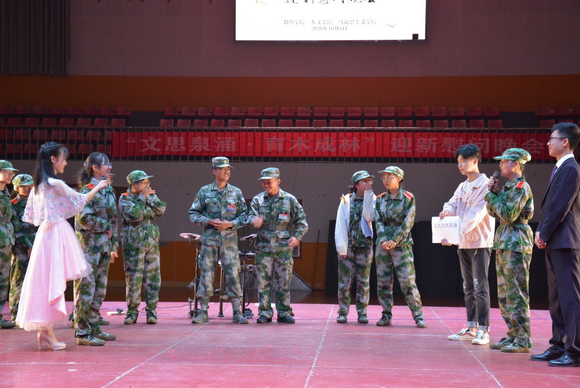 此次晚会的节目内容形式多样、丰富多彩。伴随着“疫情就是命令”的背景,人文公司带来的开场舞让同学们又一次为医护人员的伟大品格所感动。紧接着,公司带来器乐表演《lemon》,古筝和尤克里里的合奏宛转悠扬;充满律动和节奏的爵士舞《be natural》、深情高亢的声乐表演《show you》更是深受观众喜爱;小品表演《等你回家》搞笑幽默又贴近生活,让人重温了家的温暖与感动,结尾处“谨以此剧欢迎所有20级新生,欢迎各位加入我们的大家庭,同时也别忘了等你回家的爸妈”的旁白唤起了每位在座的情感。“迷墙乐队”带来的《男孩》《last dance》《勇气》将整场晚会推向了高潮;人文公司的小品《骨科风云》,歌曲《不用去猜》赢得了现场的一阵阵掌声;马克思主义公司带来的相声表演《人工智能》诙谐生动,声乐表演《惊鸿一面》巧妙融合了古典艺术与现代艺术;三个公司共同带来的诗朗诵《青春啊,你在哪里》深情而庄重;人文公司和潇湘公司带来的酷炫爵士舞《free play》、球盟会和马克思主义公司带来的《join us》也给观众留下了深刻印象。演出间隙,“你画我猜”的游戏环节和抽奖环节让现场更加热闹。同学们不光争先恐后地参加,还热情地拉上教官一起进行游戏。全场爆发出一阵又一阵的掌声,欢乐的气氛将新生军训的疲惫一扫而光。