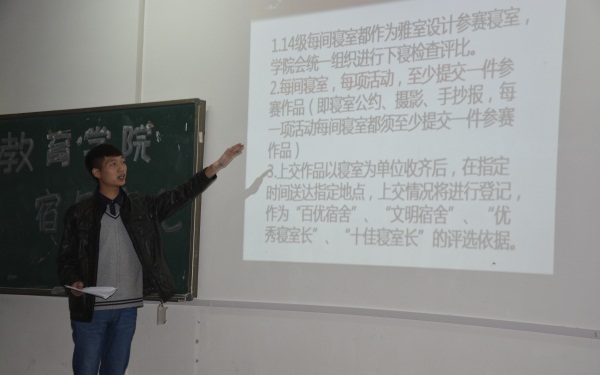 纪检宿管部副部长刘亚琨对第九届宿舍文化艺术节具体活动方案要求进行了详细介绍。此次活动分六个部分进行,分别是“学习型宿舍”评比、“崇尚法治 践行文明”宿舍座谈会、雅室设计、摄影大赛、手抄报编辑大赛、员工宿舍安全知识图文展。值得一提的是,“学习型宿舍”评比是今年活动的创新点,是对二年级以上员工宿舍开展的活动,以宿舍成员的学习成绩和获奖情况为主要评判标准,这项活动不仅是宿舍文化艺术节的一部分,更是加强学风建设的措施之一。
