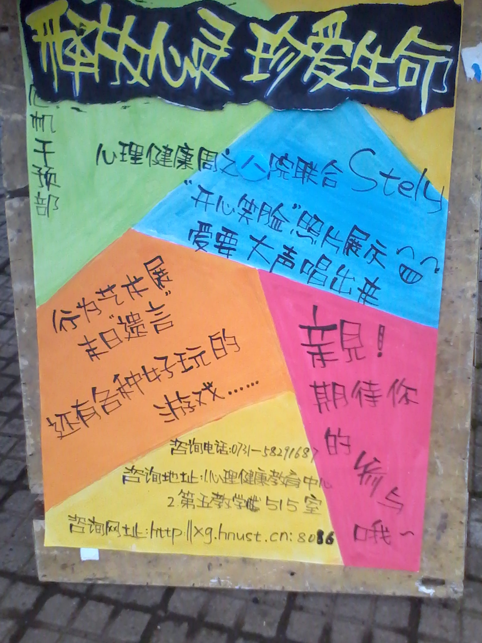 2012年12月11日,在热火朝天的江南style的集体舞蹈后,由球盟会心理健康教育中心联合湘潭大学心理协会主办的“释放心灵,健康人生”活动在公司的北校区电信路口正式举行。此次活动的承办单位有公司的8个公司,球盟会作为主要的承办方之一,可谓做足了功夫:七彩海报的制作、开心笑脸的收集等无不体现着我们的充足准备。