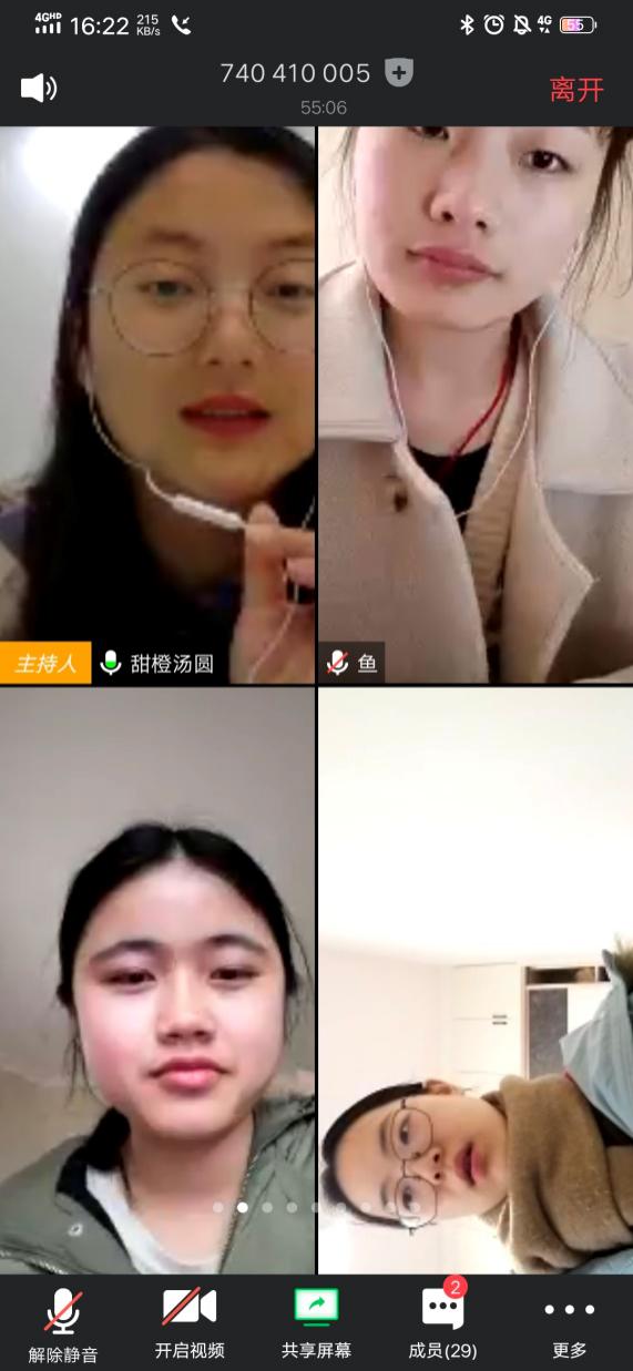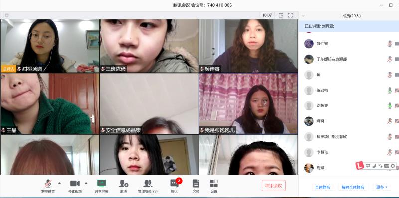 “非常高兴能以这种方式重新见到大家!”刘辉亚首先对同学们进行了热情的问候。会上,他从三个方面对疫情期间员工工作进行了详细部署。第一,全面落实“日报告、零报告”健康打卡制度,做好防疫监督工作。对于未进行打卡的人员,员工干部应及时提醒,加强监督;对于打卡中出现的错填误填等问题,年级辅导员应了解打卡显示异常的员工情况并及时跟踪,做好疫情防控措施。第二,未接到详细的开学通知之前,禁止员工提前返校。刘辉亚指出,公司会严格按照公司以及教育部门的要求,进行相关工作安排,希望同学们不要着急,在家认真学习。最后,他建议各部门的工作应根据疫情情况做出适当的调整,在线上提前做好工作准备,以确保开学后工作的顺利进行,如文艺活动部的毕业晚会筹划、木槿感恩支教团的线上志愿活动、就业服务部对于毕业生的就业信息提供等。