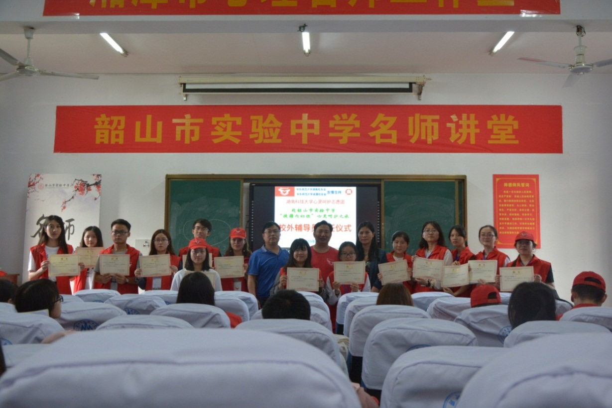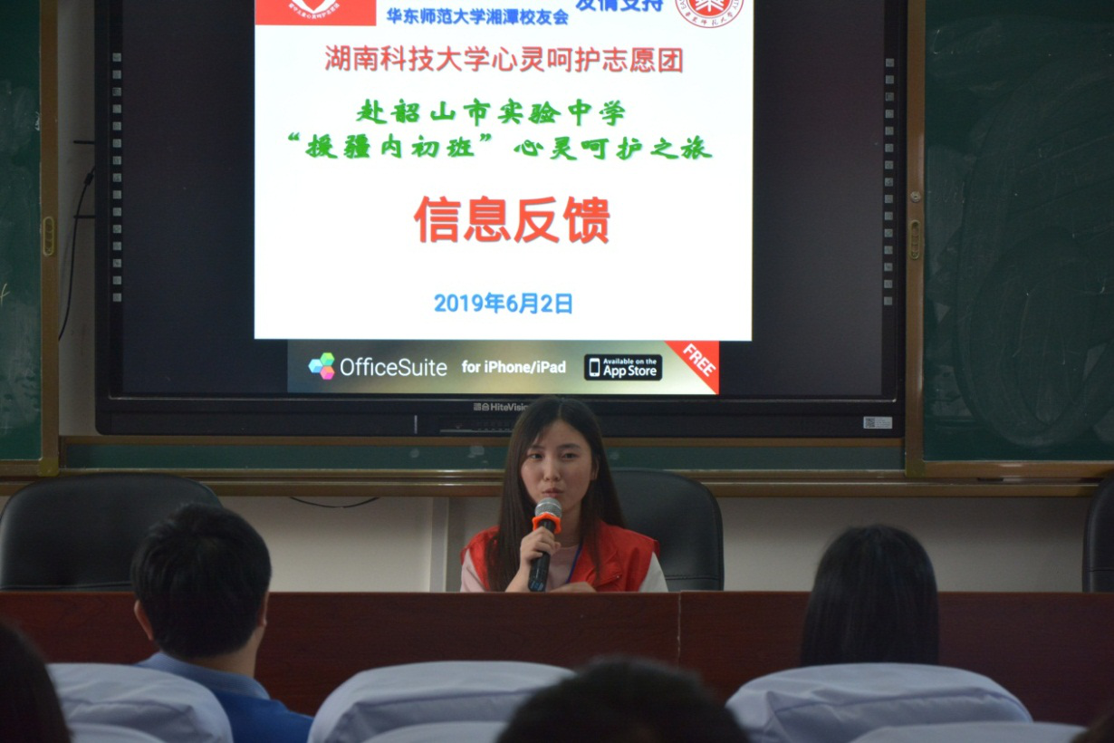紧接着便举行心灵呵护汇报会,各个主试汇报了一天的观察情况,详细讲述了呵护对象存在的问题、有何表现、可能的不良后果及造成的原因,也给校领导、老师及监护人提出了相应的建议,并希望可以进行长期跟踪。活动最后一项外辅导员聘任仪式,校方为感谢志愿者们的积极付出正式聘请志愿者们为韶山实验中学的心理健康教育辅导员。