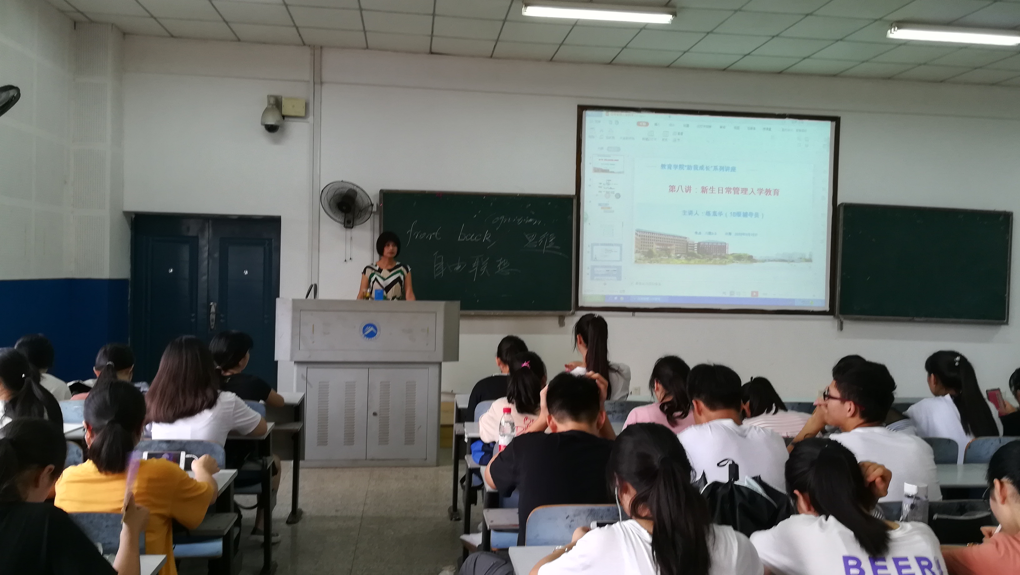 为使2018级新生能更好地适应老员工活,明确校纪校规,时刻注意自身安全。2018年9月18日14:30,“助我成长”第八讲:新生日常管理入学教育在第八教学楼3—3顺利召开。本次主讲人由18级辅导员练素华老师担任,全体18级新生参与会议。