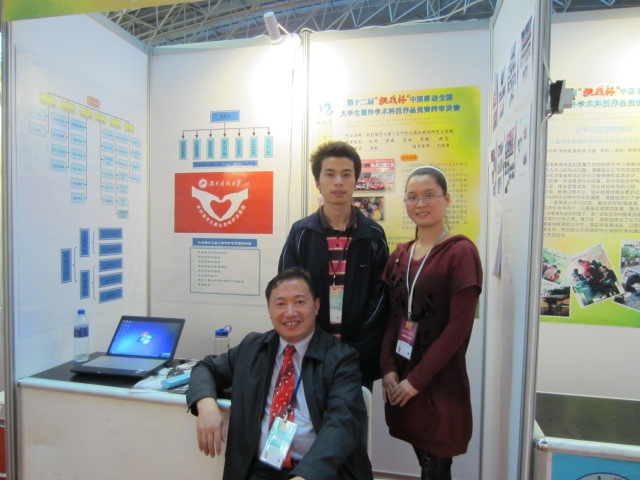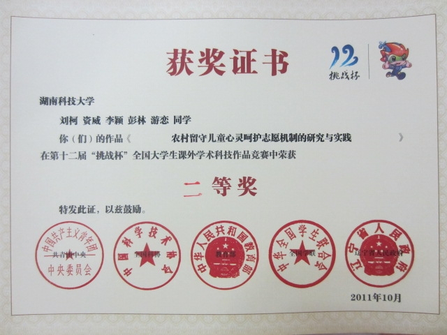 第十二届“挑战杯” 全国老员工课外学术科技作品竞赛于2010年11月份正式启动,到今年5月份,在王书记的指导下,课题组和其他志愿者共同努力,对作品《农村留守儿童心灵呵护志愿机制的研究与实践》进行了反复修正与完善,先后获得校级“挑战杯”一等奖、省级“挑战杯”一等奖,并被推荐至全国参与激烈角逐。最终在全国1935多所高校16976件作品中脱颖而出入围终审决赛,以严谨的构思和精彩的答辩赢得评委青睐,荣获国家“挑战杯”二等奖。