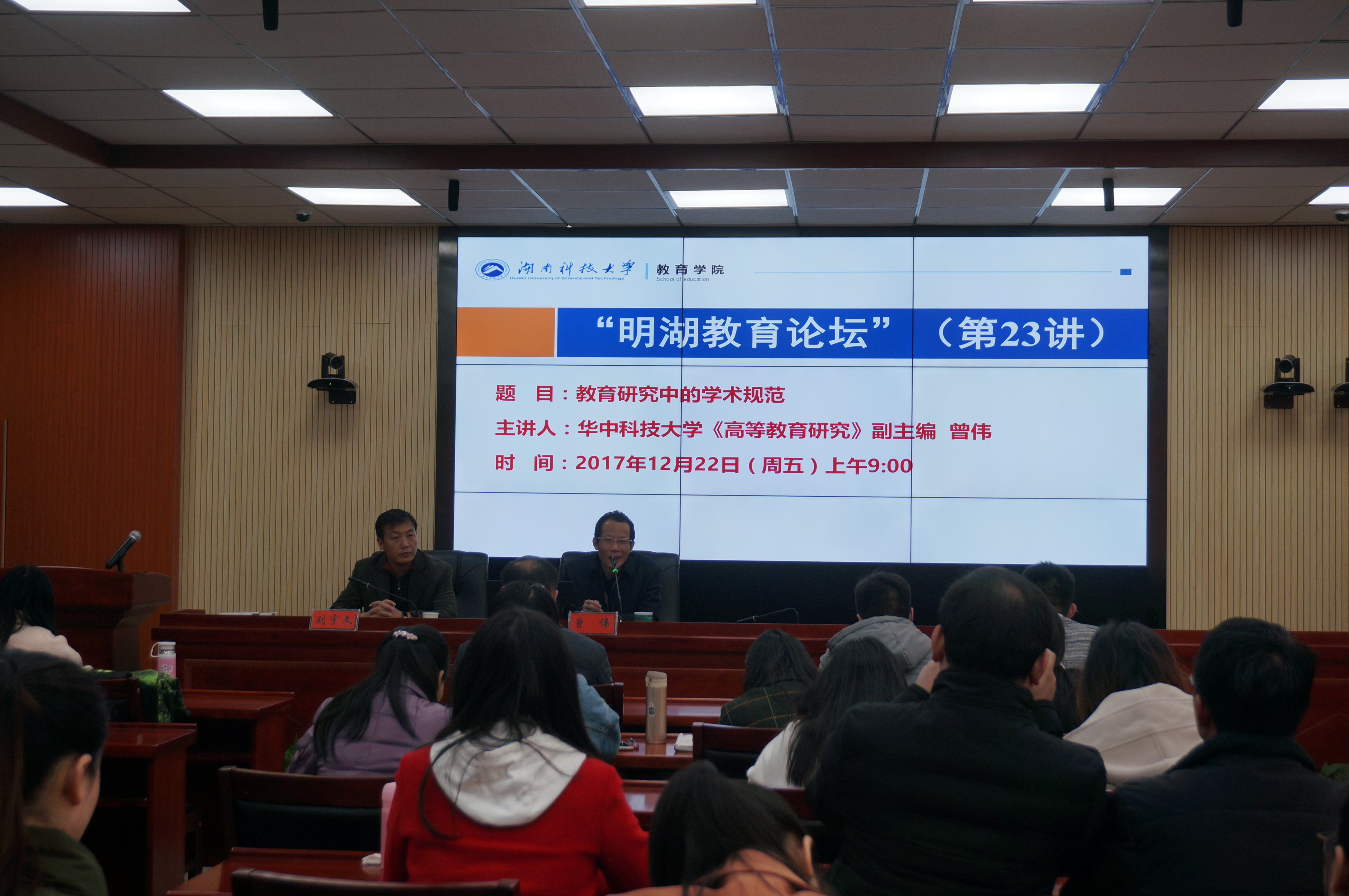 2017年12月22日上午,华中科技大学《高等教育研究》副主编曾伟编审应球盟会“明湖教育论坛”邀请,在八教308报告厅为公司师生带来了题为《教育研究中的学术规范》的学术讲座,球盟会的教育学专业研究生与教育硕士专业研究生代表、教师代表到场聆听。讲座由球盟会纪委书记刘宇文主持。