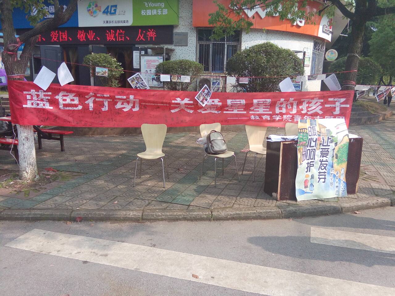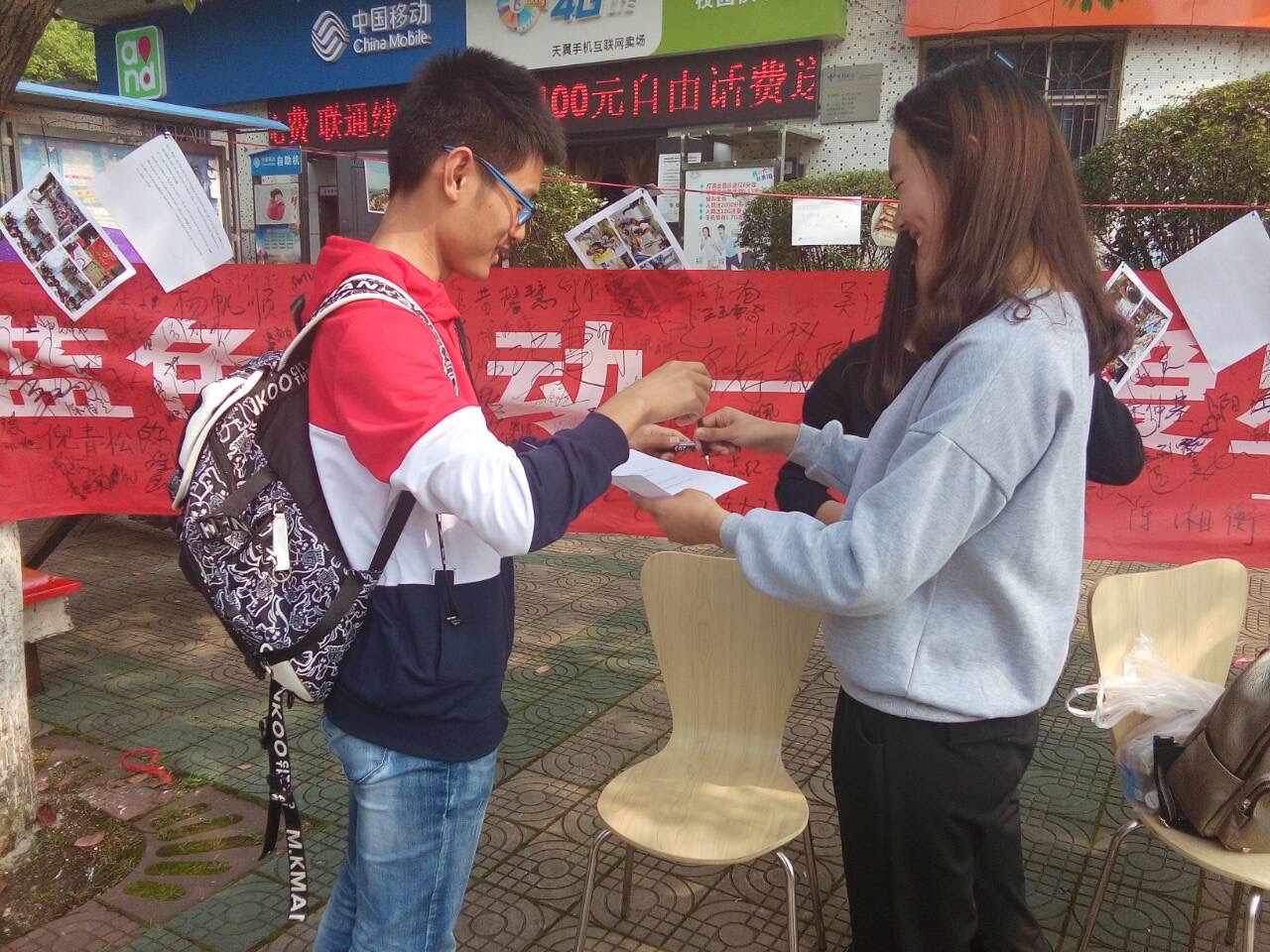 “你好,能打扰一下做一个关于自闭症儿童的调查问卷吗?”,“你好,能在关爱自闭症儿童的条幅上签一下名字吗?”2016年4月27日,在北校电信路口有那么一群可爱的人,拿着问卷和签字笔不断地向路过的员工发出邀请,日头渐渐西斜,人来人往却不曾停歇,在这里,由球盟会青年志愿团的志愿者们开展的“蓝色行动——关爱星星的孩子”志愿活动正在有序进行着。
