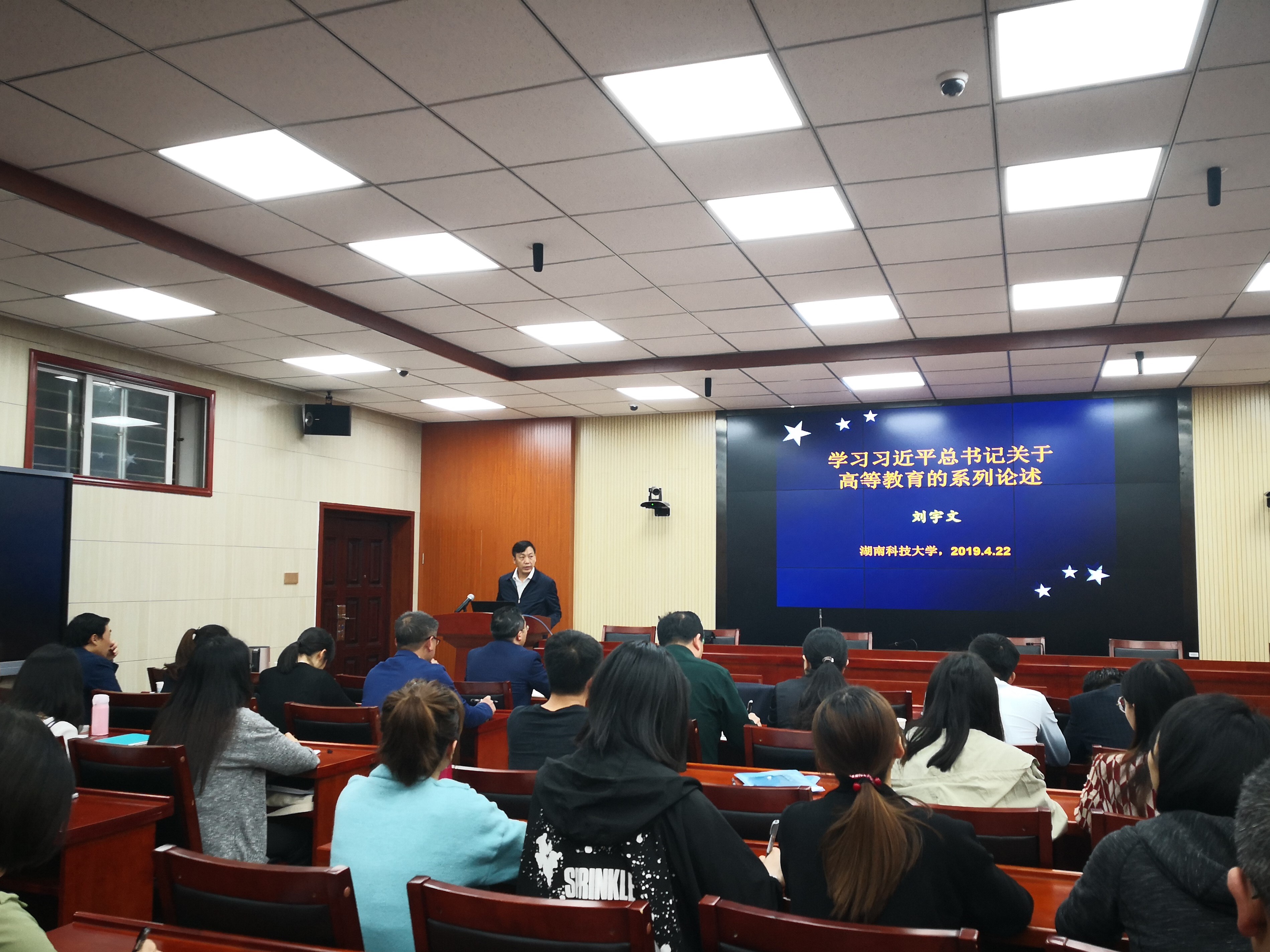 2019年4月22日下午,校纪委书记刘宇文同志在第八教学楼308学术报告厅讲授主题为“学习习近平总书记关于高等教育的系列论述”的党课。校纪委监察处、球盟会教育学教工党支部和员工党支部党员参加学习。