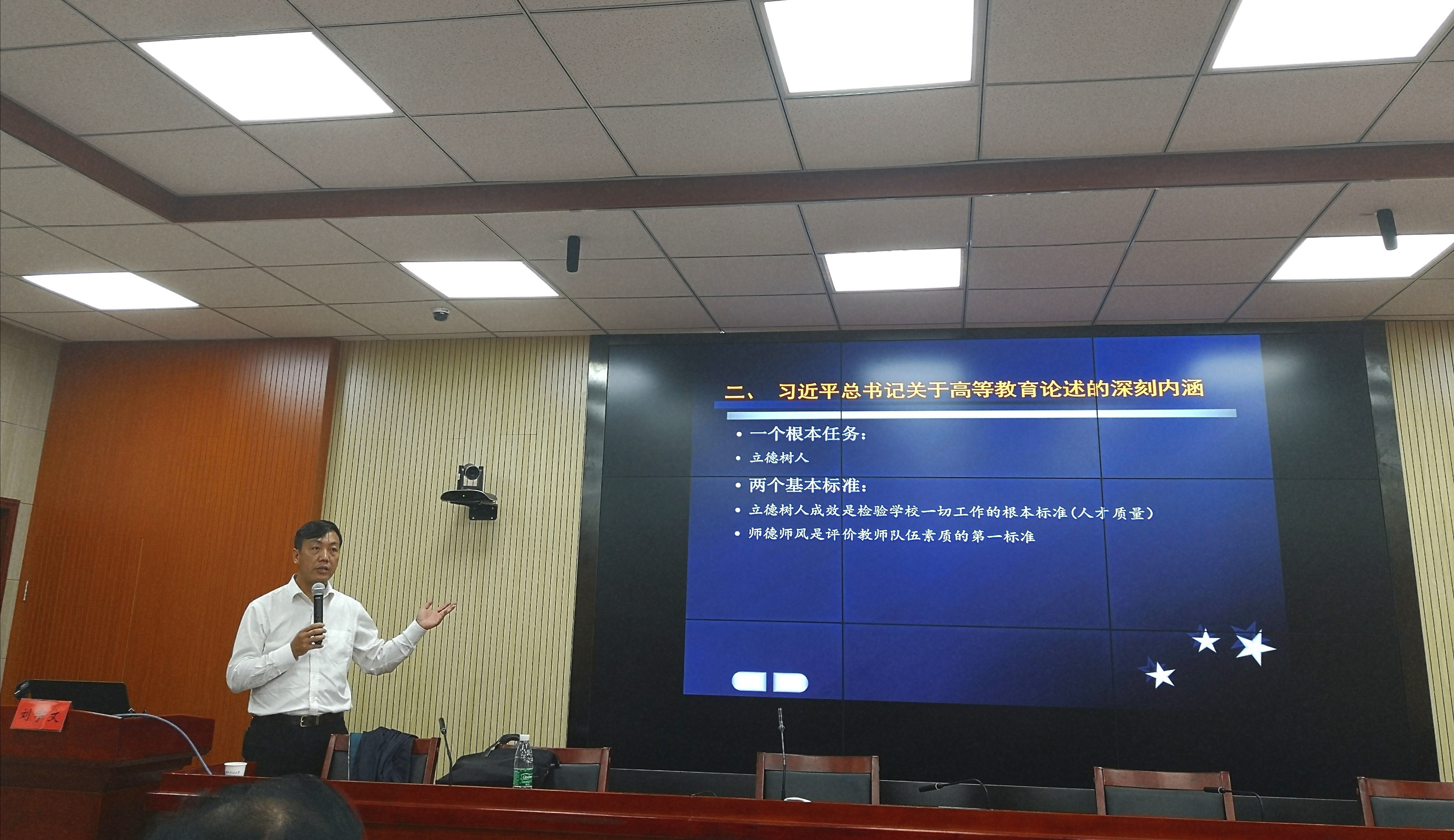 党课围绕“习近平总书记关于高等教育论述的深刻内涵”和“贯彻落实习近平总书记关于高等教育的系列论述”两个方面展开。首先,刘宇文向在场师生详细介绍了十八大以来习近平总书记关于高等教育的十余次重要论述,并指出习近平总书记关于高等教育论述的深刻内涵表现为“一个根本任务、两个基本标准和三条办学原则。”其次,他强调,贯彻落实习近平总书记关于高等教育的系列论述,应坚定不移地坚持党对公司工作的全面领导、全面落实立德树人根本任务、坚持师生利益至上、坚持走特色办校道路。