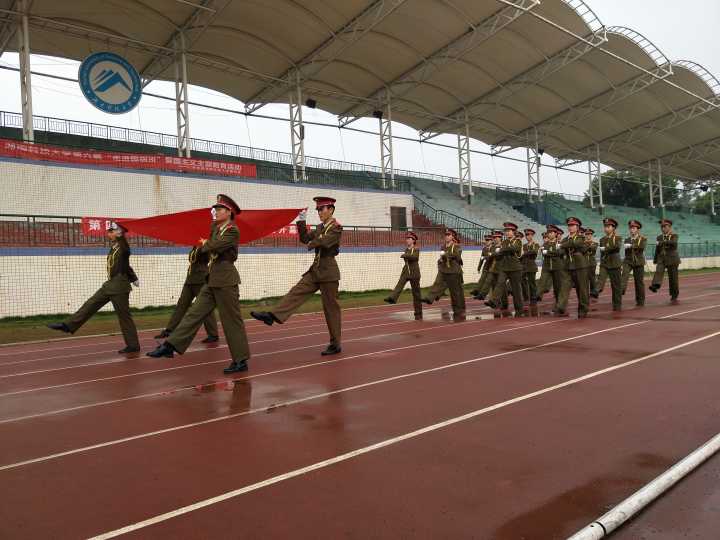 仪式第一项,全体肃立,迎国旗。田径场上整装待发的同学们经历了一周的刻苦训练,终于穿上了梦寐以求的军装,他们以最勃发的姿态扬起手中那面最鲜艳的五星红旗。他们步伐整齐划一,脚步铿锵有力,面容严肃而庄重,仍旧带着稚气的脸上有了身为中华儿女的飞扬神采,眼神中充满了坚毅与顽强,那是经过历练后的坚定不移。海纳百川终破浪,厚积薄发在此时,他们经过了严格的筛选和一周的刻苦训练终于在走到了最后,给我们带来了一场完美的升旗仪式。