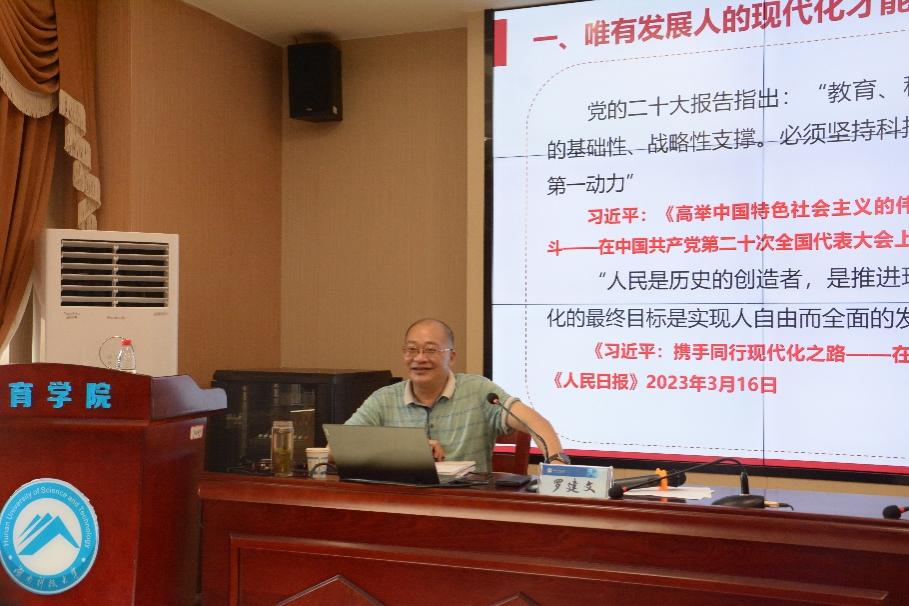 18日下午,球盟会马克思主义公司罗建文教授为书记董事长班带来题为《中国式教育现代化的根本任务就是实现人的现代化》的学术讲座。他提到唯有发展人的现代化才能真正实现教育现代化,努力造就符合中国式现代化本质要求的高素质人才,全社会要形成一种不拘一格培养人才的良好氛围。