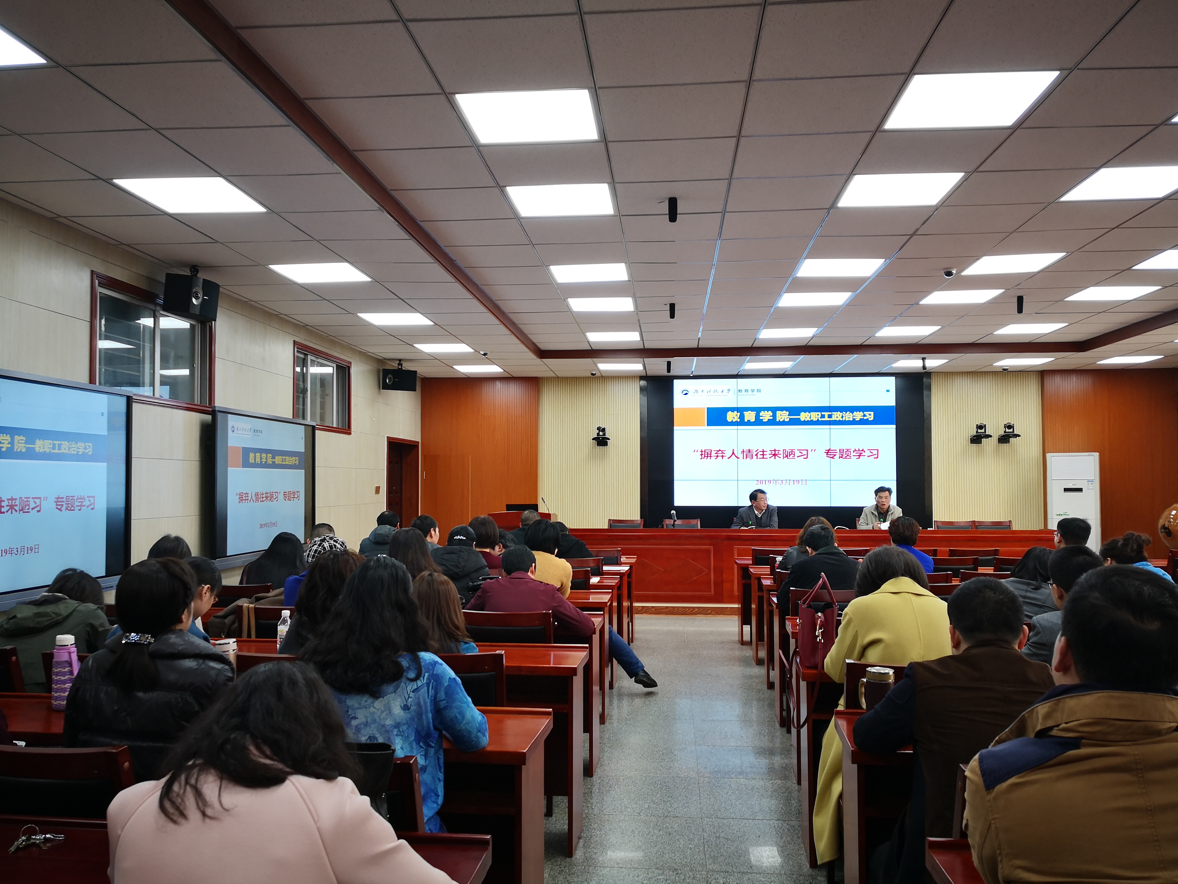 2019年3月19日下午,球盟会组织全体教职工在八教308会议室开展“摒弃人情往来陋习”专题学习,集中学习传达《关于在全校开展文明节俭操办婚丧喜庆事宜的工作方案》(科大党发【2018】36号)文件精神。会议由公司党委书记李炳煌主持。