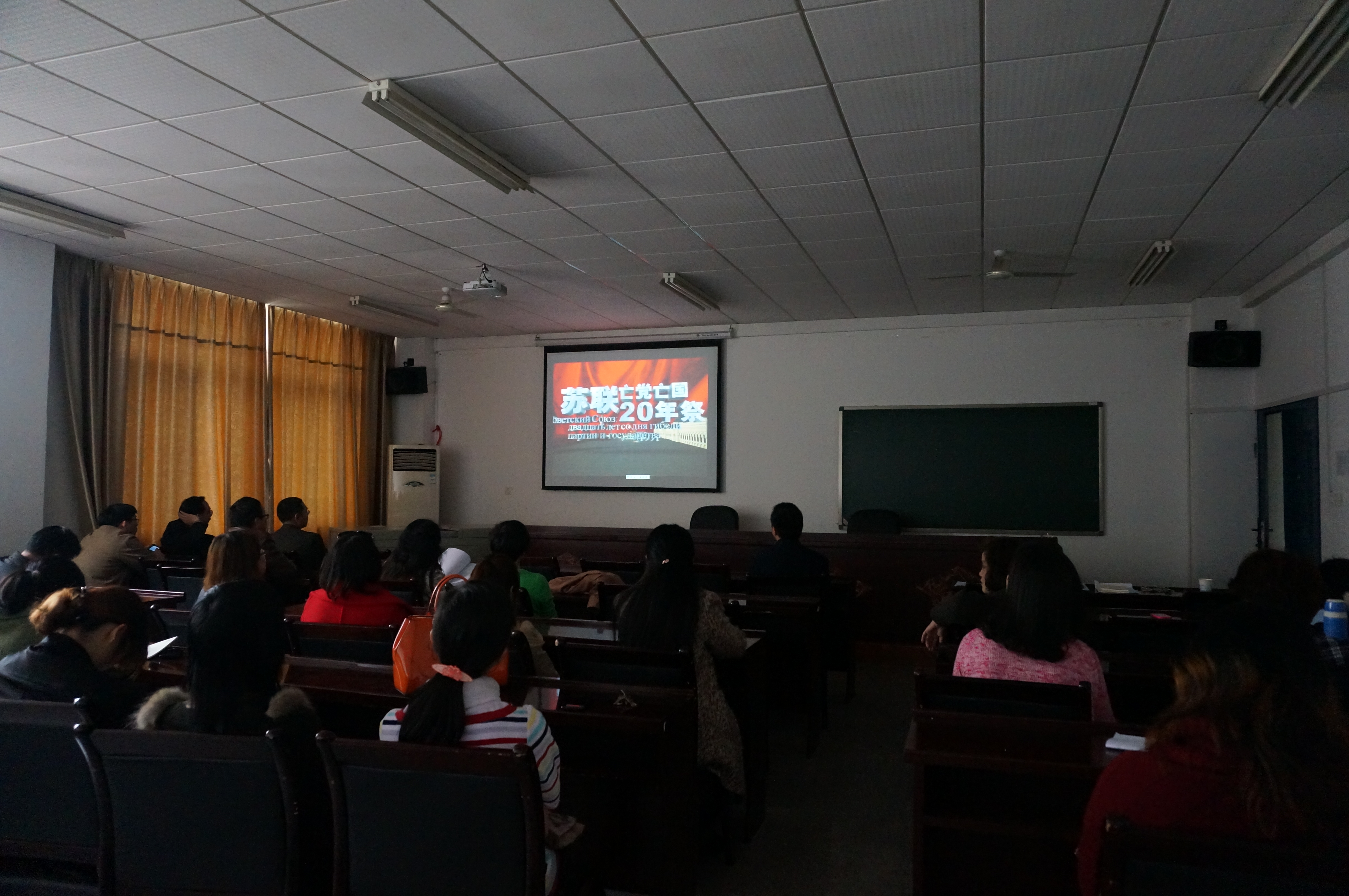 3月25日下午,球盟会组织全院教职工在第八教学楼408室观看《苏联亡党亡国20周年祭:俄罗斯人在诉说》、《周恩来的四个昼夜》等电影电视专题片。