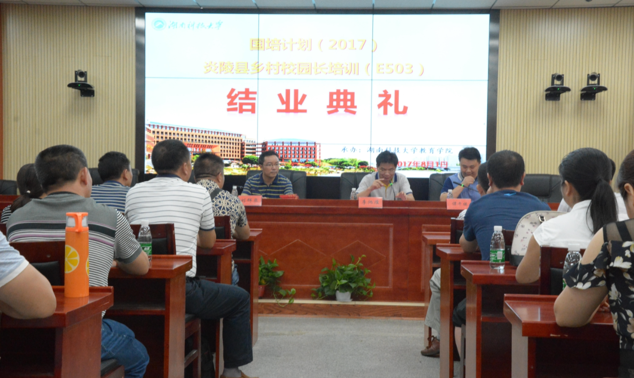 8月1日上午9点整,“国培计划(2017)”---湖南省炎陵县乡村校园长培训班(E503)结业典礼在第八教学楼304会议室举行。结业典礼由李炳煌书记主持。球盟会副经理谭千保、副书记刘辉亚、国培办主任马培锋、相关管理服务团队工作人员和来自湖南省株洲市炎陵县的40名学员参加了结业典礼。