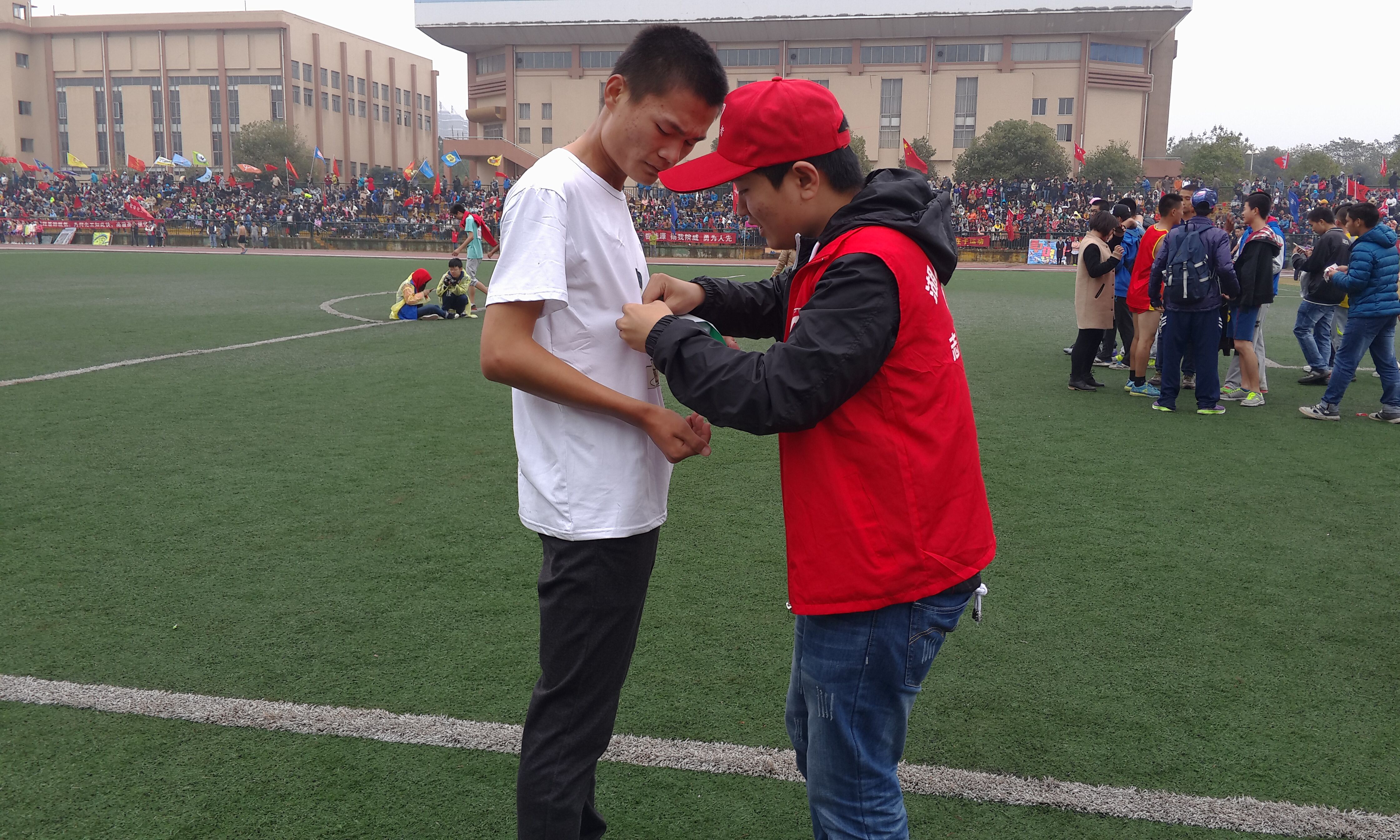 和信息队一样,在赛场上默默贡献着的还有这些辛劳的蜜蜂们——志愿者。当接受采访时,球盟会15级小教一班郑巧玲说道:“看运动员们真的好辛苦,有些长跑完以后还吐了,有些身体不舒服的还是硬撑着跑完了,感觉他们是在用自己最大的努力为公司争光。”她还介绍,这次运动会,志愿者分搀扶组,衣物组,巡逻组和总服务台。搀扶组负责搀扶已经比赛完的运动员,一旦有异常,必须马上报告。而作为小队长的她正在这个组里。衣物组负责管理好运动员的服装,小物件,天气比较冷,组员们应该及时将衣服给运动员穿上。巡逻组则负责保证赛道安全,而总服务台则负责各种东西的保管,对运动员的提出的要求及时实现。各组各司其职,保证运动会的顺利进行。“累吗?”“应该的,运动员更辛苦”这群勤劳的小蜜蜂们在赛场上穿梭,谱写着志愿者之歌!