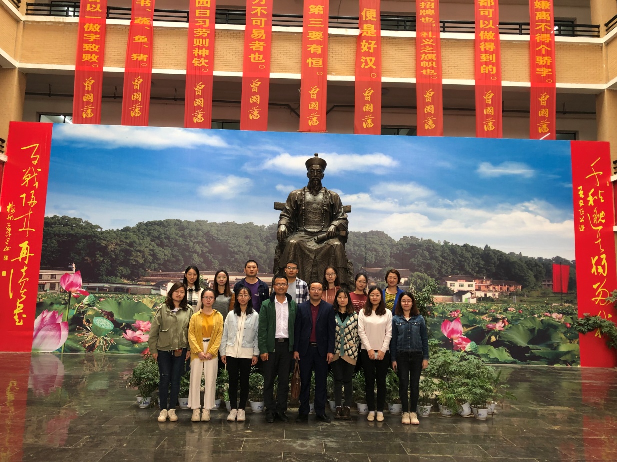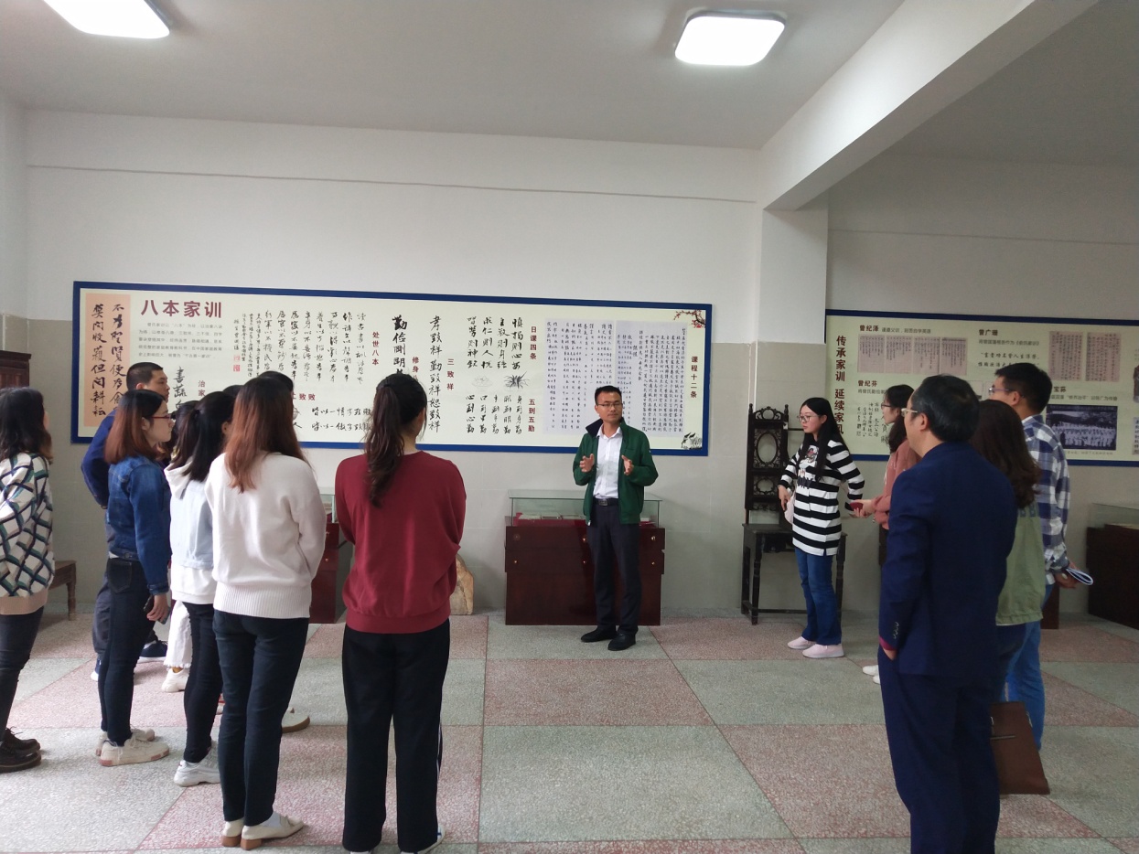 随后,曾国藩公司领导带领实习生团队参观了校内的曾国藩家史馆,王育龙副董事长亲自担任展馆解说员,从“八本家训”到“三致祥”再到“英才辈出”,将曾氏家族百余年的历史娓娓道来,实习生们听得津津有味,也被曾氏家族勤俭、求学、务实的家风家训所深深感染。最后,双方领导与实习团队在文正公塑像前合影留念。