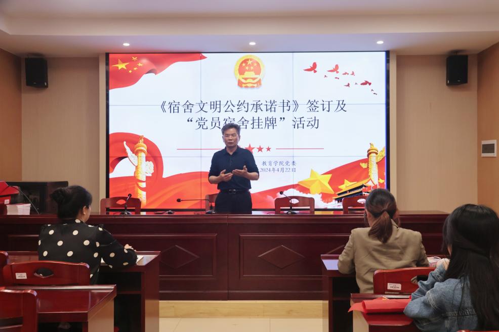 2024年4月22日晚,球盟会在敏行楼A333开展《宿舍文明公约承诺书》签订及“党员宿舍挂牌”活动。会议由员工党员邹宇欣主持。公司党委书记李炳煌、副书记文红梅出席。党支部书记及全体员工党员参与。