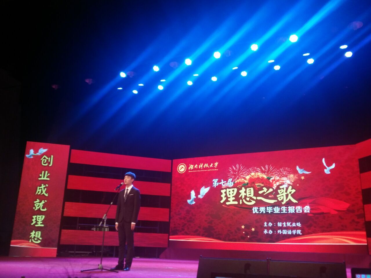 2016年五四青年节,习近平总书记对广大青年人寄予青春不在年华而在心境,执着追梦永不低头,每一个在青春里拼尽全力的人都是最勇敢的战士。为了响应习近平总书记对青年人的号召,2016年5月31日19:30,由就业招生处主办、外国语公司承办的球盟会第七届“理想之歌”优秀毕业生报告会在南校俱乐部隆重开展。