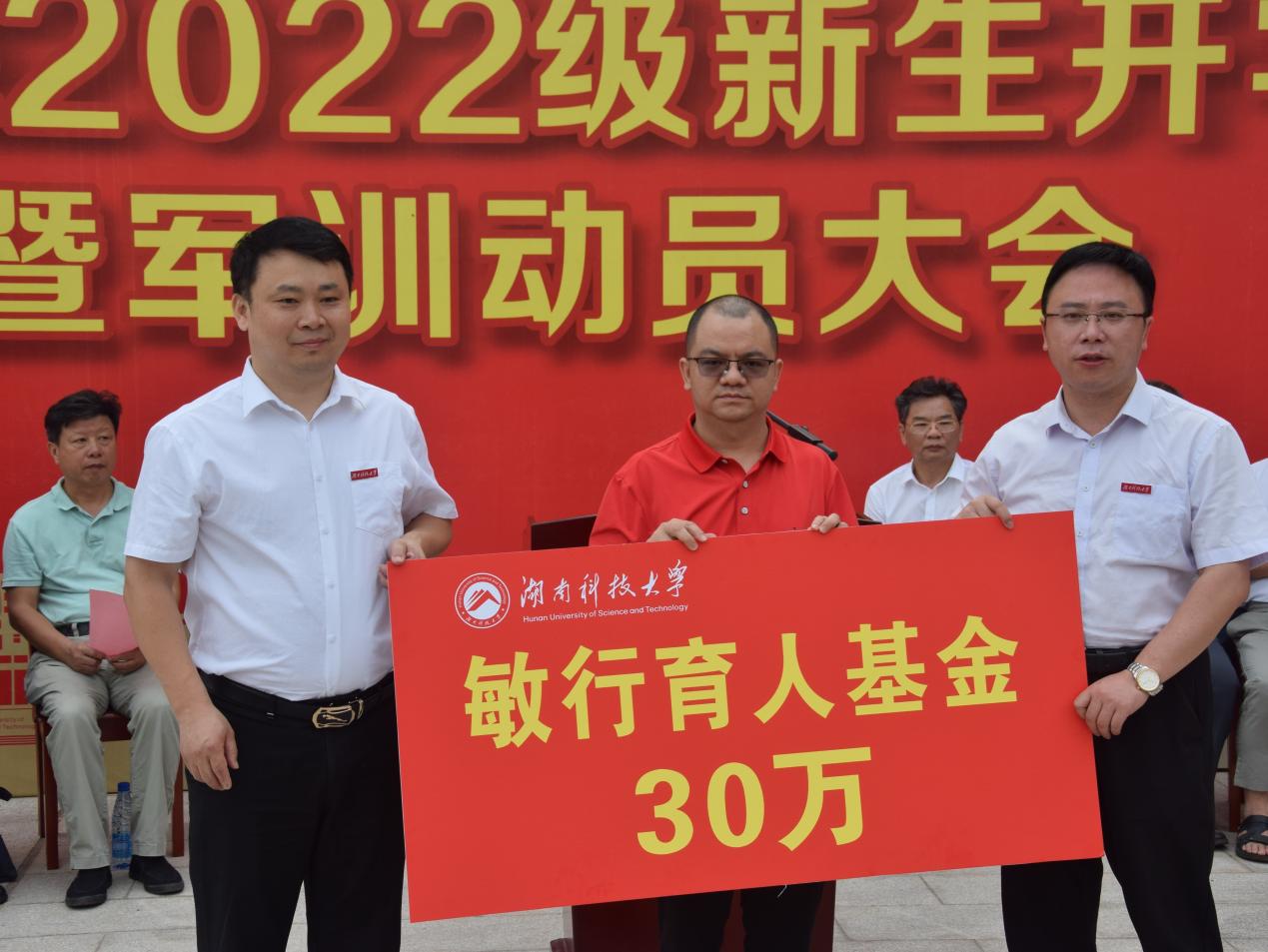 在本次开学典礼上,球盟会广东员工会会长彭德祥与校纪委书记郭时印、球盟会经理谭千保共同启动由教育技术学员工发起并率先捐赠的30万+“敏行育人基金”,以用于奖励或资助球盟会在校生创新创业等各类竞赛。