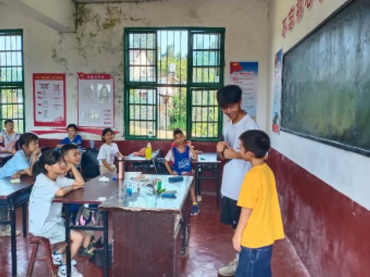 本次支教活动的地点是村里以前修建的一所小学,这里群山环绕,生活条件比较艰苦,简单的三间宿舍、两间教室和一间办公室就构成了教员们的日常活动场所。天气炎热,只有头顶呼呼作响的风扇默默记录下支教的故事。