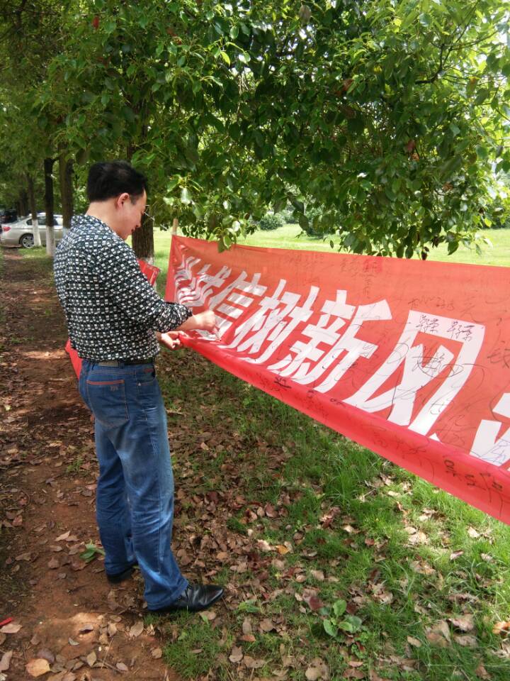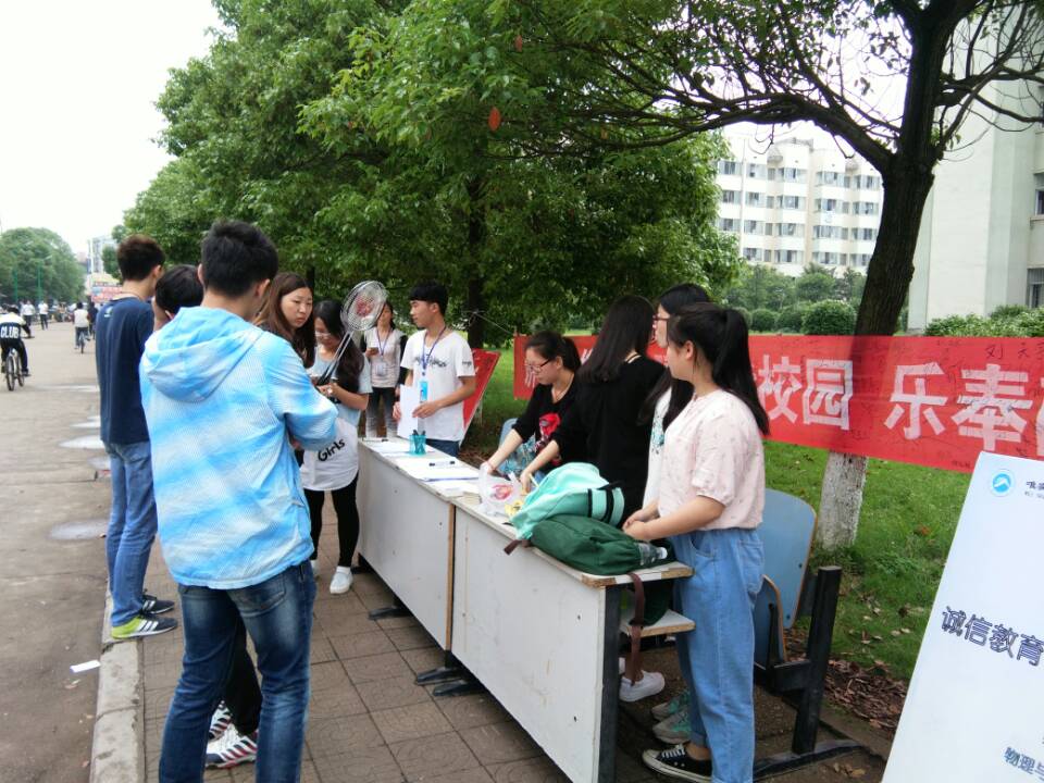 “讲诚信树新风建和谐校园,乐奉献知感恩筑正气中国”。 2016年5月30日,球盟会、数学与计算科学公司和外国语公司在北校七区联合开展了诚信宣传展板活动。三个公司的负责人早早拉起了横幅,将宣传展板,展台摆好,准备好诚信讲解内容和诚信快答问题,开始一天的宣传活动。