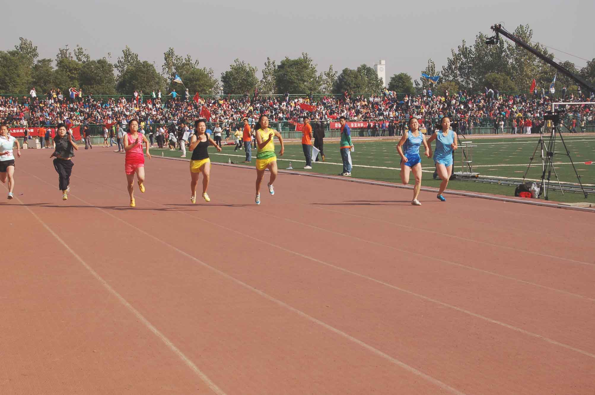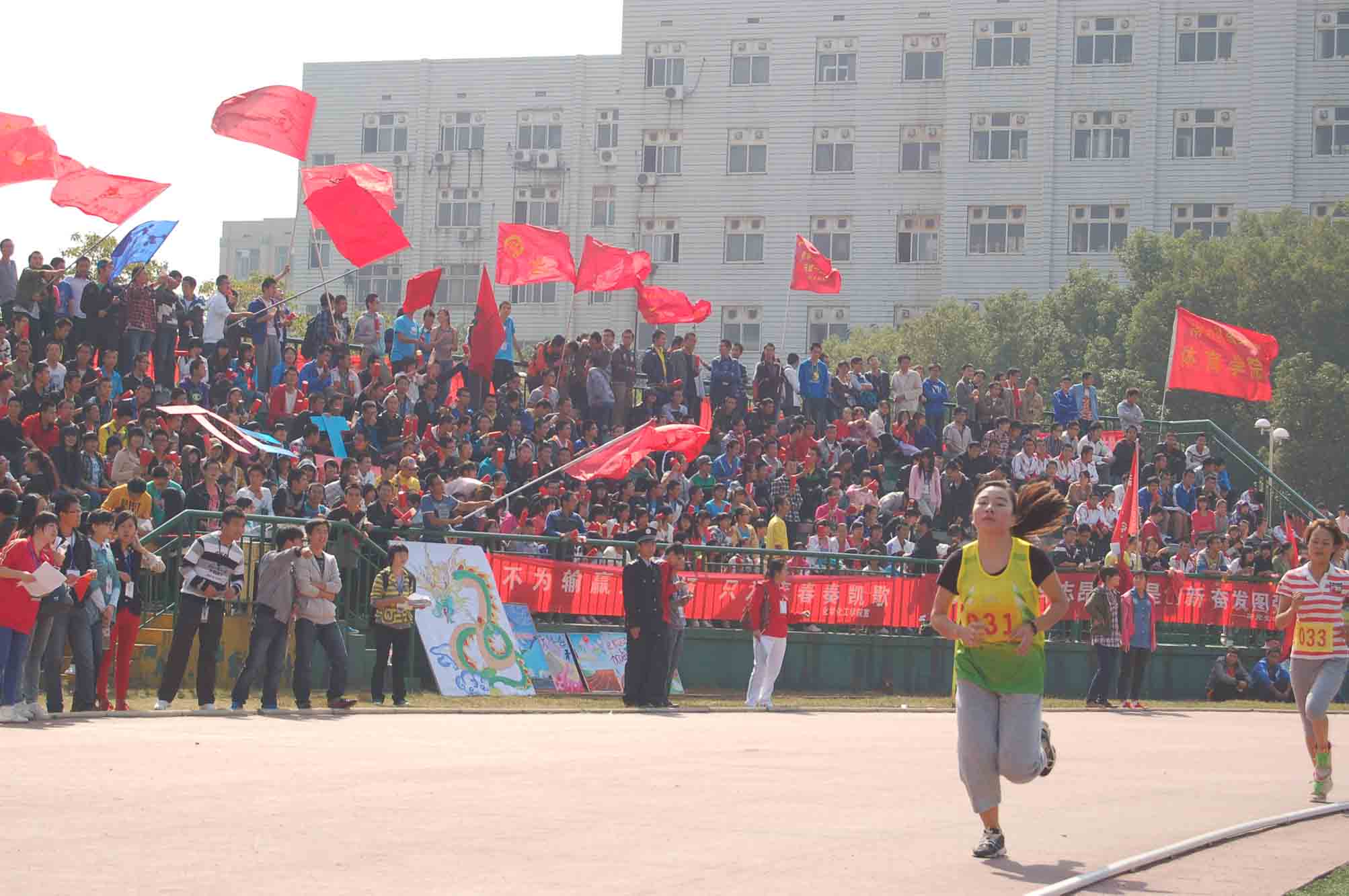 在球盟会的看台上,我们的院旗不断地挥舞着,啦啦队员们整齐助威,专注地看着田径场上的比赛,他们比赛场的选手更紧张、更激动。每当运动员们从我们的观众席前经过时,便掀起一阵欢腾的海浪,呐喊声便一节高过一节,激情澎湃的啦啦队员们让青春的朝气蓬勃在观众席上的助威声中展现地淋漓尽致,鼓声、哨声、呼喊声、尖叫声顿时笼罩在体育场上空。 “我们每个人都很兴奋,看到选手们在赛场上没有力气跑的时候,真想上去拉着他们跑。我旁边的同学特别卖力地在加油,吹哨子时口水都喷到我的脖子上了,希望我们放肆的呐喊声能给公司选手们带去无比的能量!”12级应用心理学一班的陈晓丹同学激动地说道。