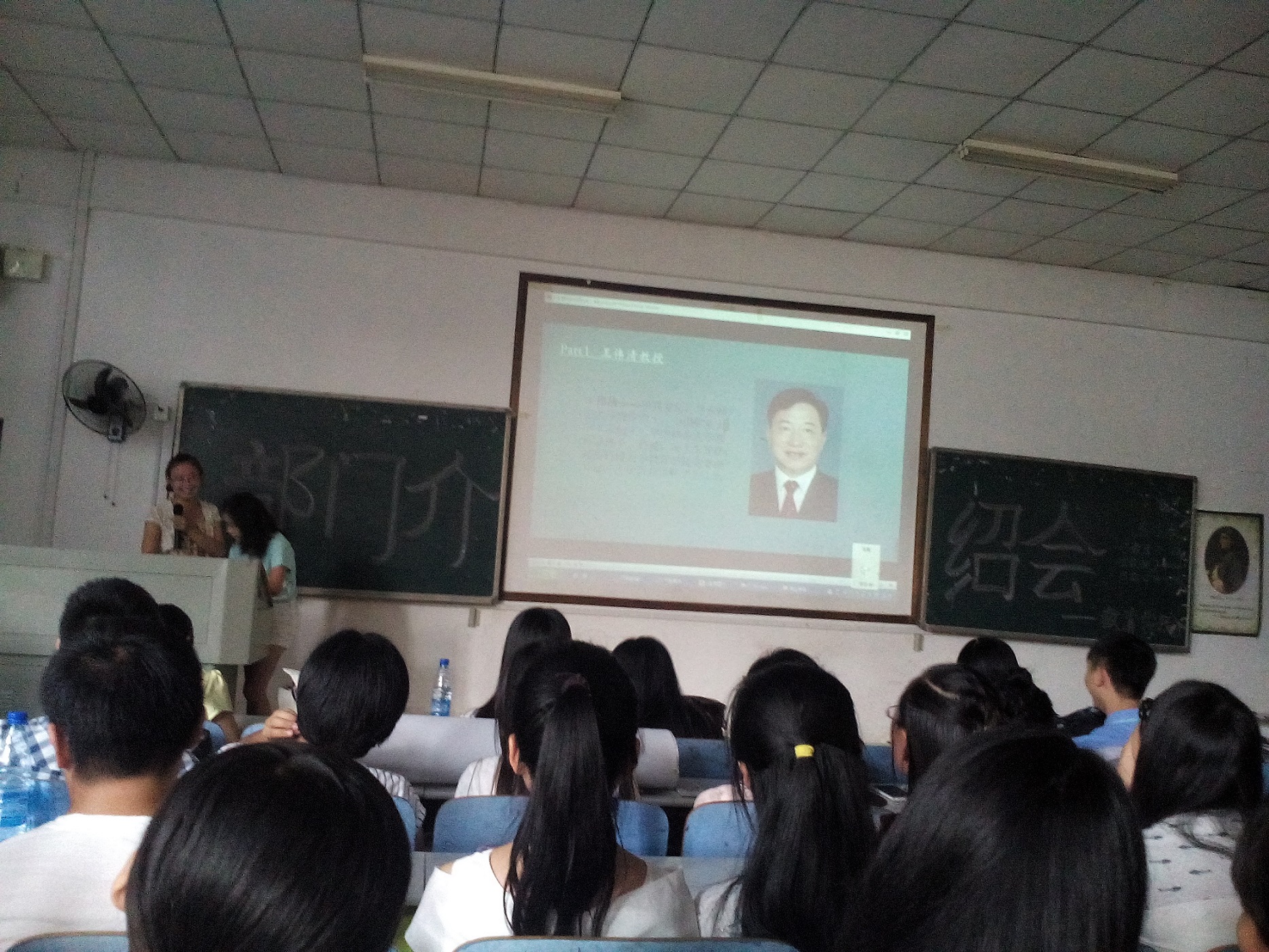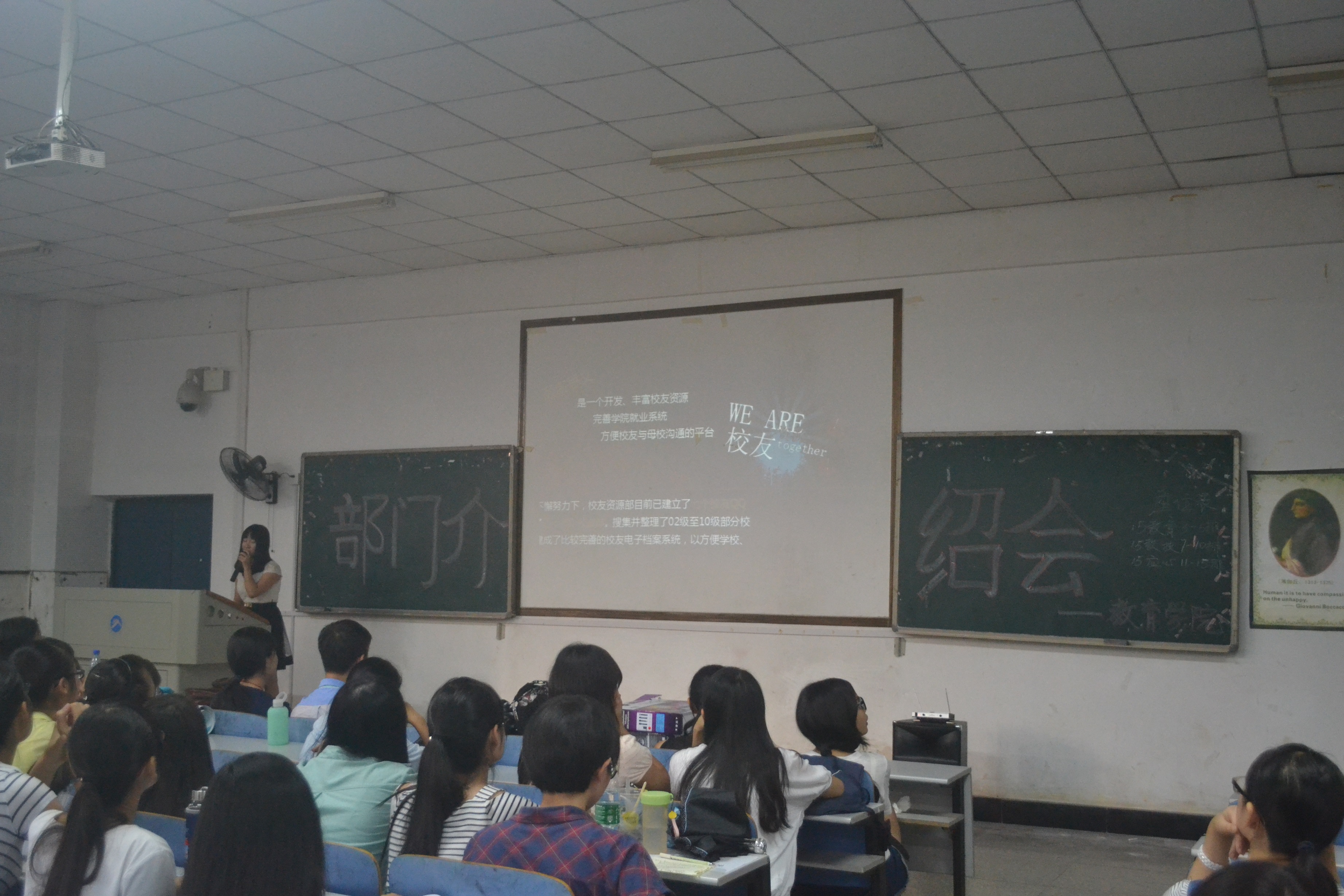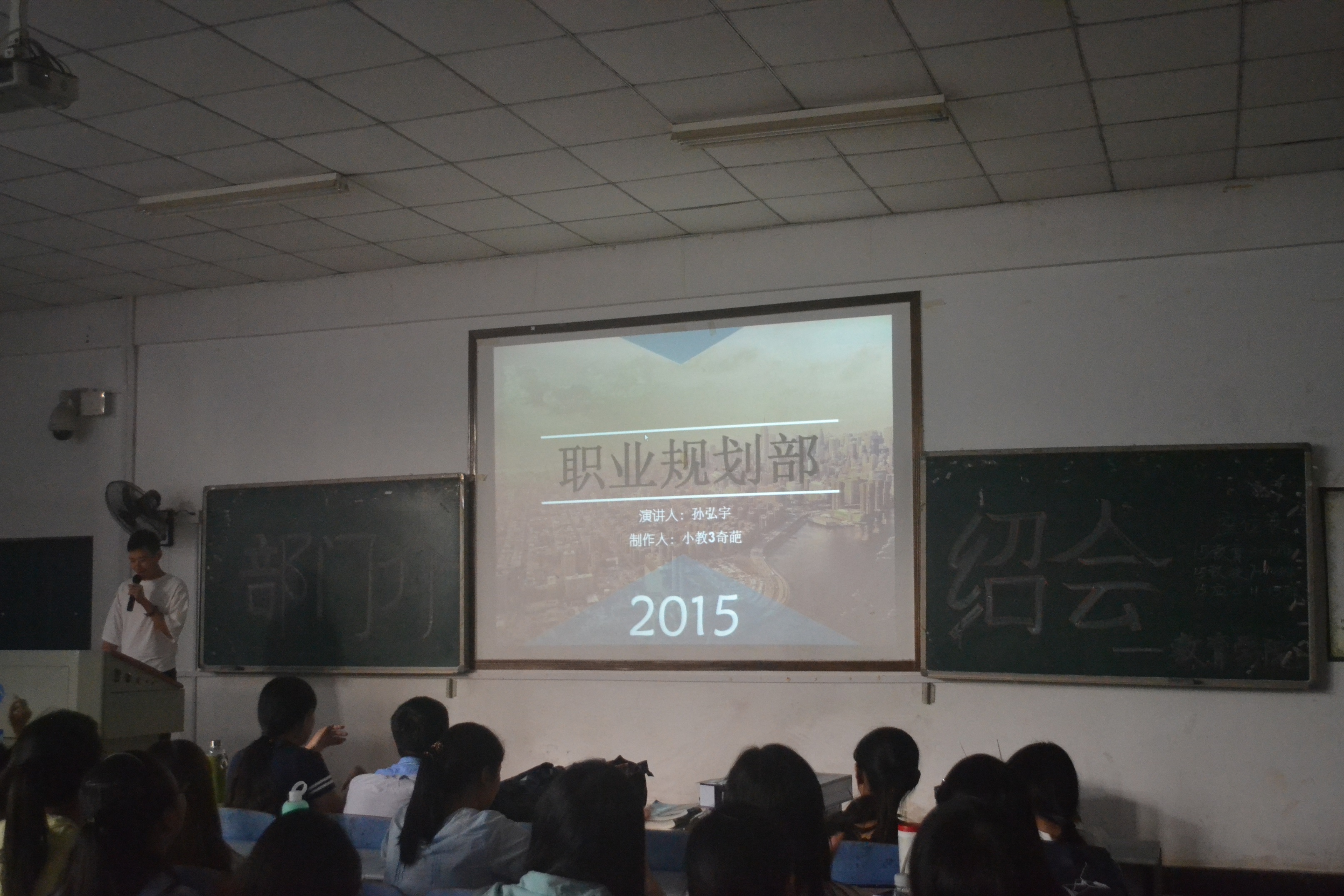 15级新生依序坐定,首发由员工会主席张彤进行第十七届主席团简介,PPT进行结构拆解,内容介绍学工办老师、主席团成员和各部门概况,强调新生选择的“归属感”。而后的党建会在多媒体展示中也在职能组成和成员介绍上进行多面普入。19个部门的轮序演示中,综合管理部以视屏和动画效果解析部门工作职能、日常管理和招新计划;组织考核部以技能型多媒体展示凸显部门优势和工作成果;纪检宿管部大呼“等到你,再出发”,几届“男神”夺人眼球;危机干预部作为“贴心小卫士”在创新,ppt效果展演中也详细介绍了工作性质内容;就业服务部、资助权益部、德育实践部、职业规划部也就大致板块进行分点讲说。广告制作部通过真人展示海报引燃现场热情;体育活动部也放话招新内部福利;员工资源部节奏快而不乱,略而不空;紧接着的学习研究部以“学”而用;文艺活动部以美动人;评估统计部、女生活动部以“活”劲人;网络信息部地气讲说趣得人心;宣传编辑部通过新闻联播形式定概部门性质,不华不话不花但尽文心。对外联络部和科技活动部各尽其力求收“鲜肉”。而在尾接的社团介绍中,木槿感恩支教、沙鸥文学社、心灵呵护志愿团也在主干性质上进行了意赅阐述。时至18时30分,介绍会拉帷结束。