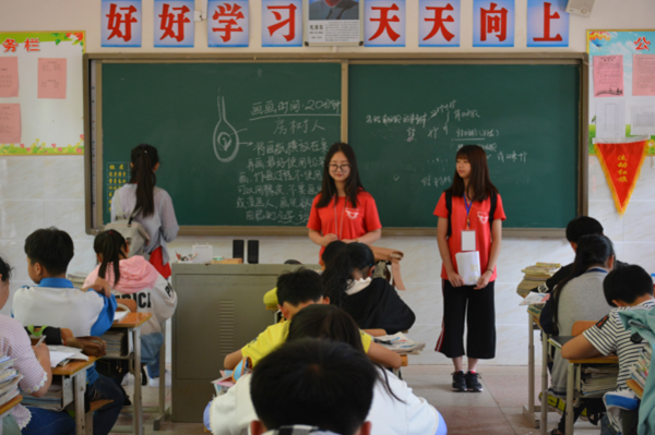 15时30分,全体32名志愿者与银田镇师生合作通力打造了绘声绘色的文艺汇演,歌曲十年、农夫渔夫,舞蹈部分明天你好、all night,还有相声、话剧、手语一系列多形式内容。