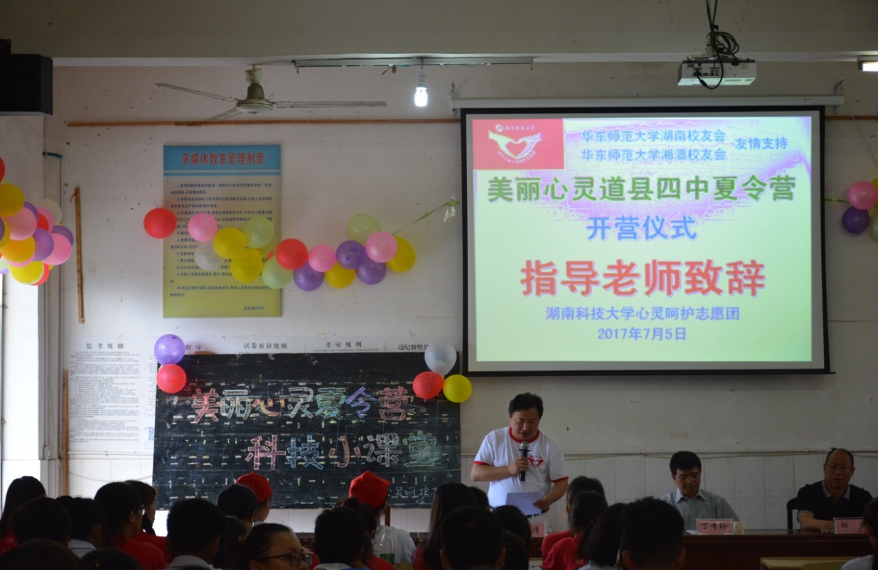 7月5日,上午九时,“2017年研究生暑期科技服务项目”暨“美丽心灵——道县四中夏令营”正式开营。球盟会留守儿童心灵呵护志愿团指导老师王伟清,道县教育局局长丁有珍,道县四中董事长胡仁出席启动仪式,研究生暑期服务队全体成员及道县四中82名员工参加开营仪式。