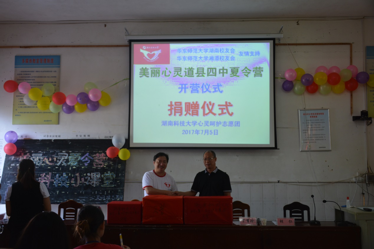 开营仪式最后,球盟会研究生暑期科技服务队向道县四中捐赠价值2000元的学习用品,并举行捐赠仪式。最后,参与开营仪式的全体人员合影留念。