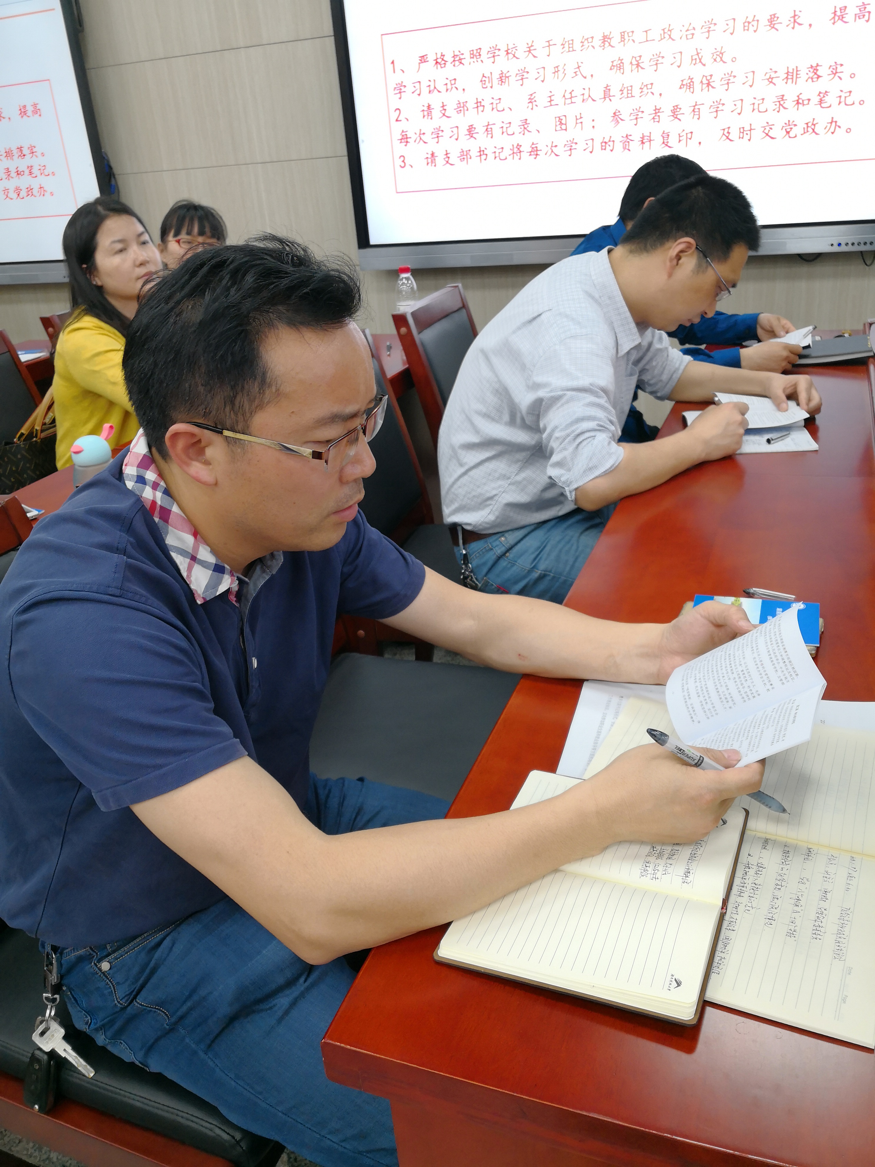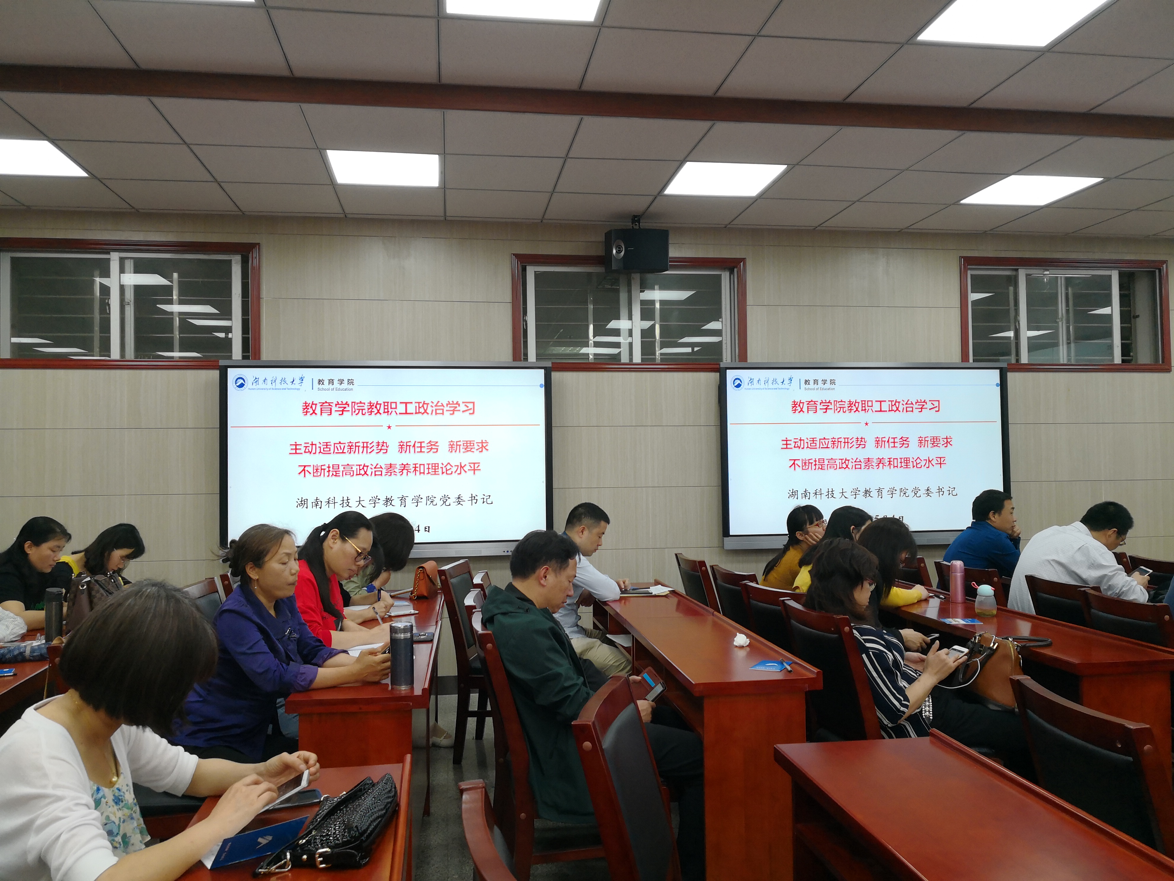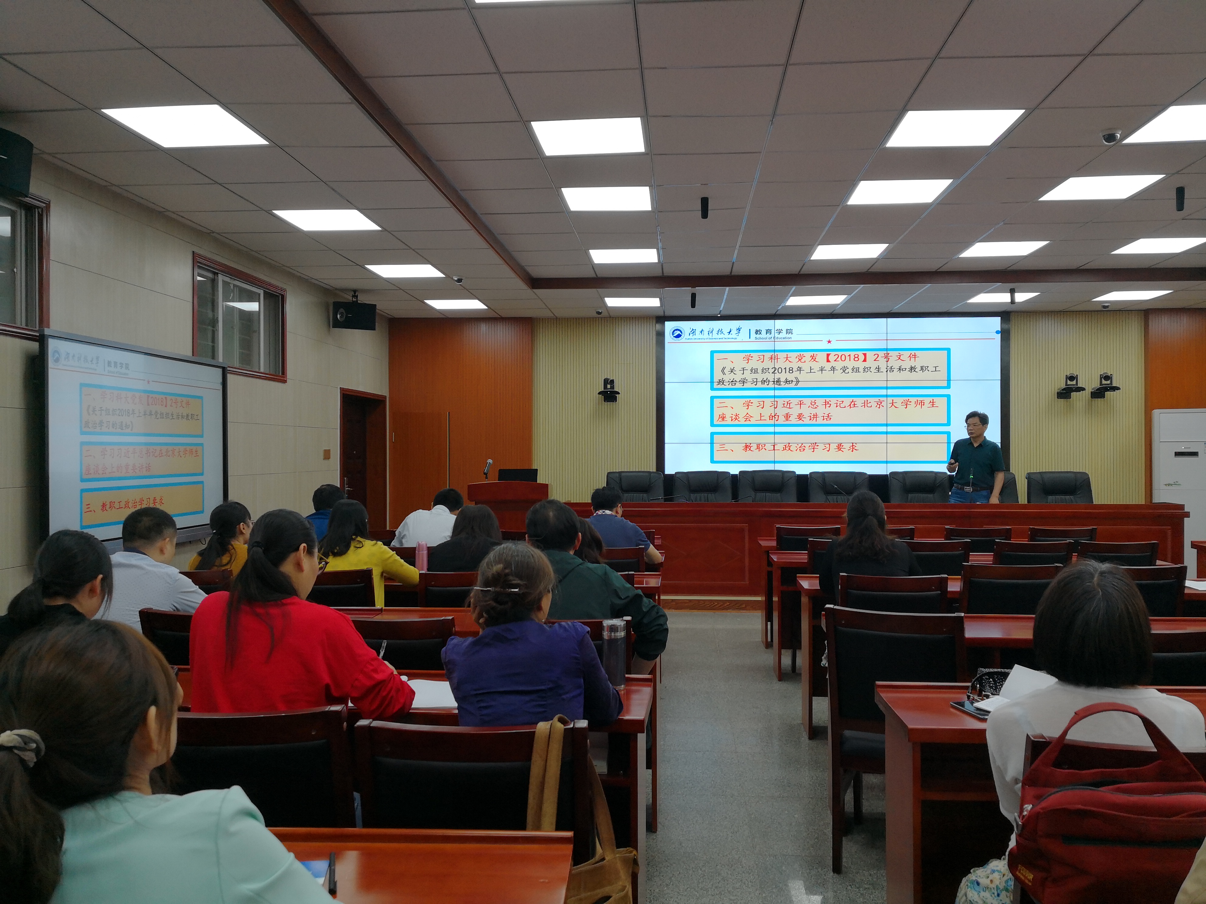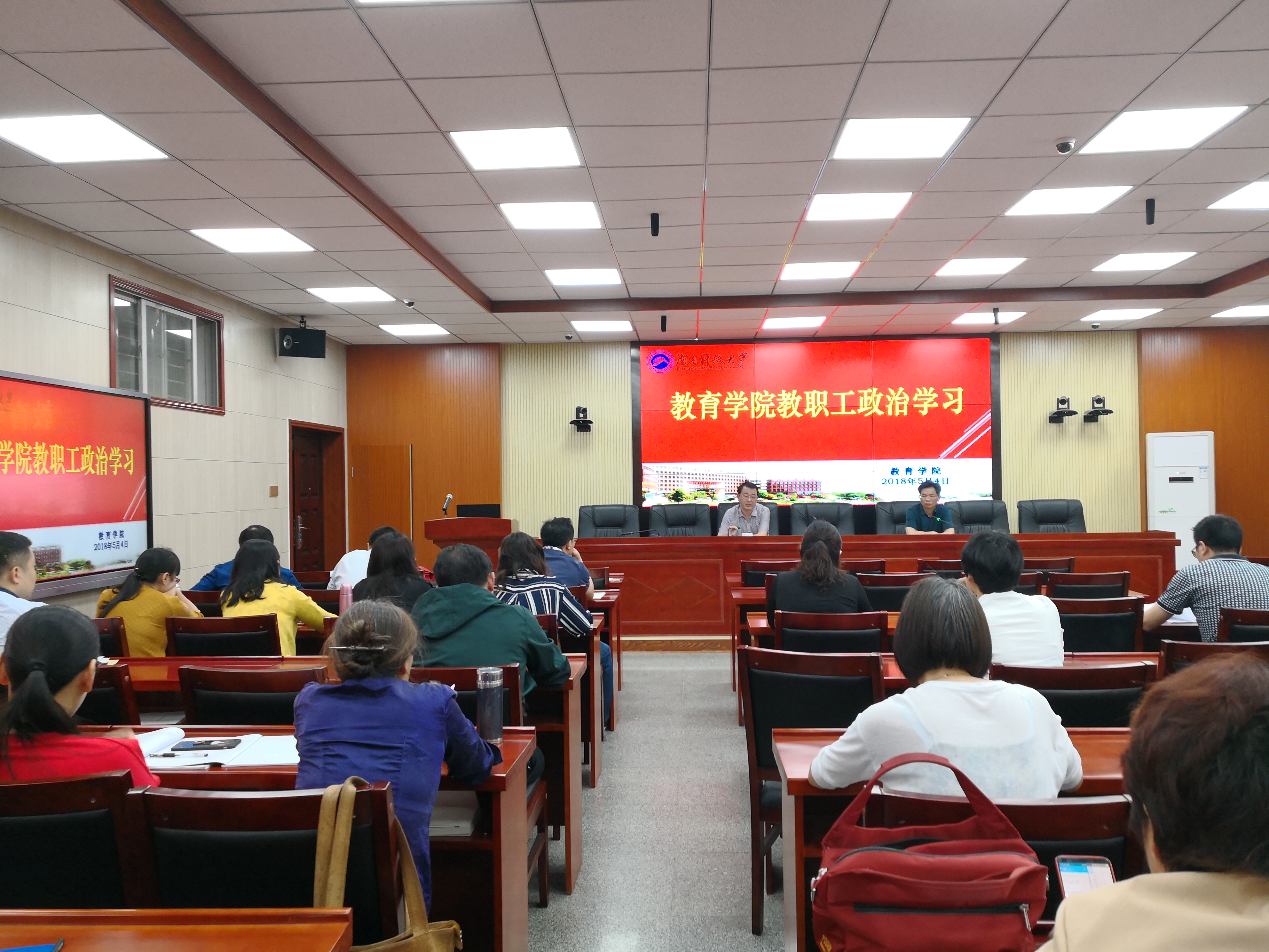 为切实提高教职工政治素质和理论水平,2018年5月4日下午,公司在第八教学楼308会议室组织全体教职工集中政治学习,学习由经理李海萍主持。