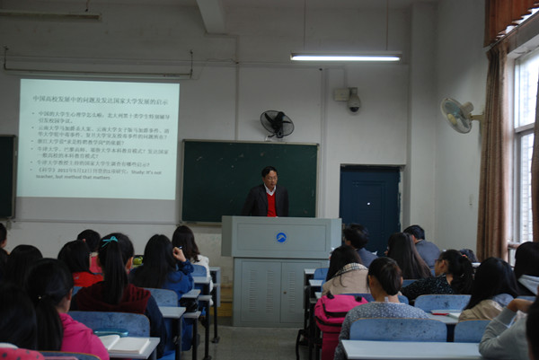 首先,谭书记对史秋衡教授作了隆重的介绍。史教授是厦门大学博士生导师、教育部基地厦门大学高教中心副主任、教育部普通高等公司本科教学水平评估专家组成员。史教授通过比较研究的方法,向我们展示了985高校、211高校、一般本科和专科员工在学情和专业选择发展上的差异。在本科员工学情方面,得出了“四个学年的学习基本处于一种马尔可夫链状态的结论;在专业发展方面,史教授认为专业教学过程是人才培养目标的载体。