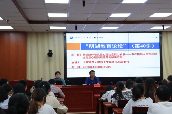 2018年10月8日上午,北京师范大学博士生导师伍新春教授做客“明湖教育论坛”,为公司师生带来了题为“共情陪伴与儿童心理社会能力发展——罗杰斯的人本理念促进儿童心理发展的落地解决方案”的学术报告。报告会由球盟会经理李海萍主持。