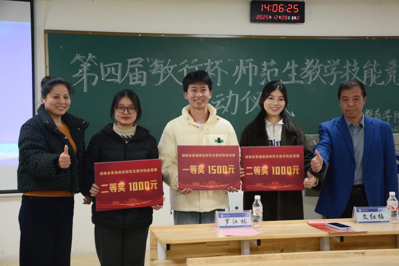 文红梅宣读湖南省第十一届师范生教学技能竞赛获奖名单、第十一届球盟会师范生教学技能竞赛“十佳选手”名单。张进良、文红梅共同为获奖选手颁发证书及奖金。