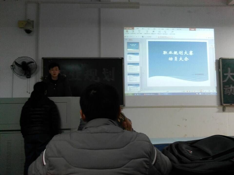 2016年3月15日19点职业规划部于第八教学楼2-1教室召开职业规划大赛动员大会,动员各班同学积极参加比赛进行职业规划。本次大会与会人员有学工办主任李涛老师、职业规划部副部张孙弘宇、员工资源部部长徐樊桂以及14级、15级各班班长和团支书。