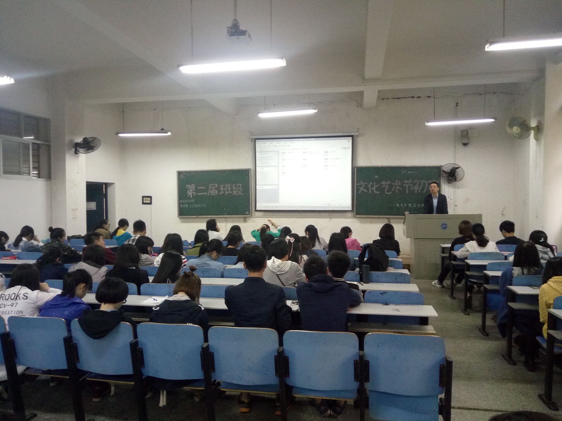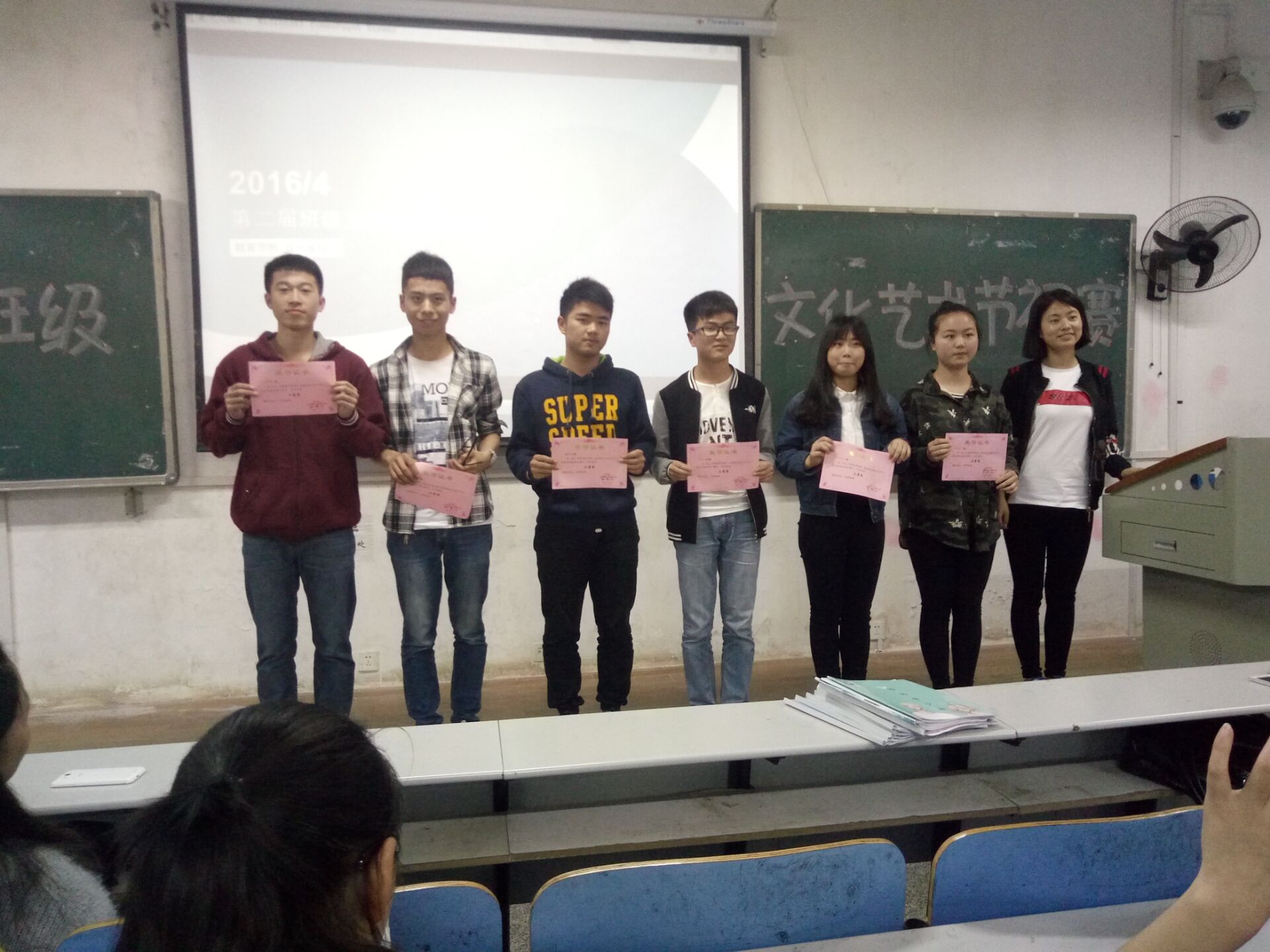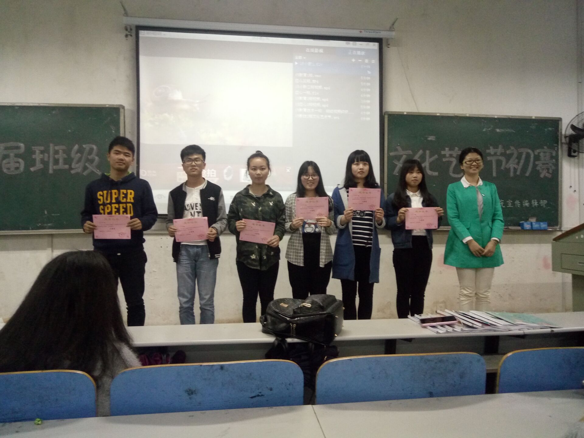 2016年4月26日14:00,球盟会第二届班级文化艺术节初赛之班级特**评比暨颁奖仪式在八教1-6正式举行。出席初赛的嘉宾有球盟会学工办老师李涛,球盟会团委员工会第一副书记徐春菊。各班围绕着“畅想青春主旋律,展现活力新班级”这一主题,通过在视频中展示班级合照,班级活动剪辑等,把班级最美的一面展现出来。