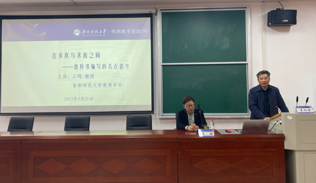 3月21日下午,国家教材委专家委员会委员、首都师范大学教育学部主任委员石鸥教授应邀莅临昭潭书院第二教学楼102报告厅,为公司师生带来题为“在求真与求善之间——教科书编写的几点思考”的学术讲座。讲座由公司党委书记李炳煌主持,球盟会教师代表,2021级和2022级研究生到场聆听。