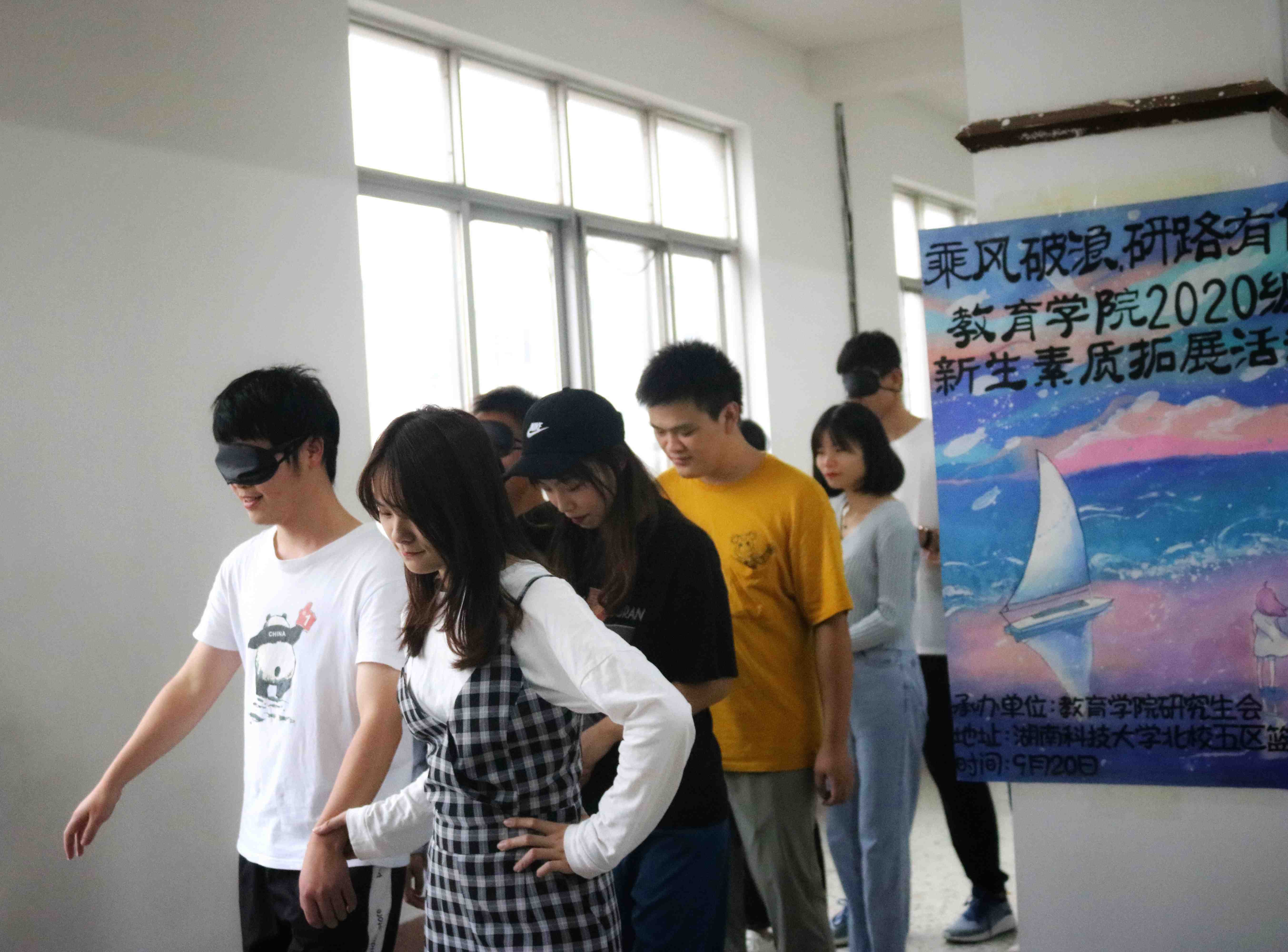 终极环节——“研路有你,友谊在孕穗”。由一位同学指引,一位同学戴眼罩跟随,大家在安全员的陪伴下,随着教练员规划的路线在校园行走。无声的陪伴与全心的信任,在这条“看不见”的“风雨人生路”上显现。