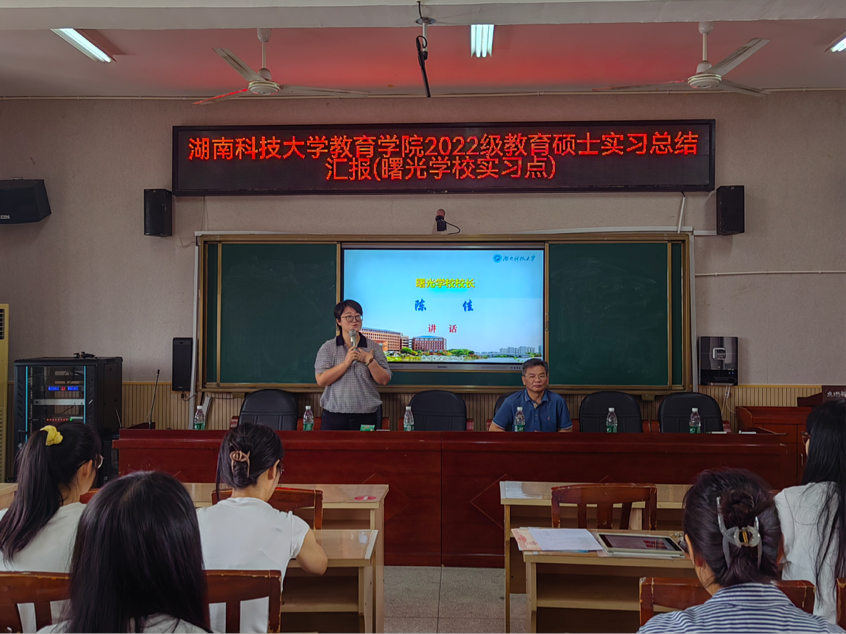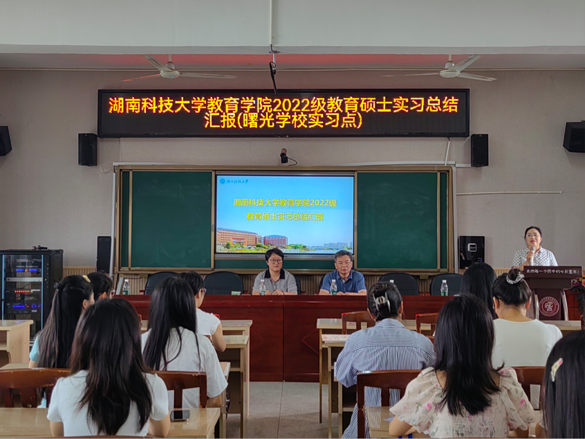 6月6日-7日,2022级教育硕士(小学教育)研究生实习汇报总结大会分别在九华和平科大小学(球盟会附属小学)和雨湖区曙光公司举行。公司党委书记李炳煌教授、小学教育系夏青博士、杨志平博士、九华和平科大小学李莉董事长、曙光公司陈佳董事长以及全体实习生指导老师和实习生参加。