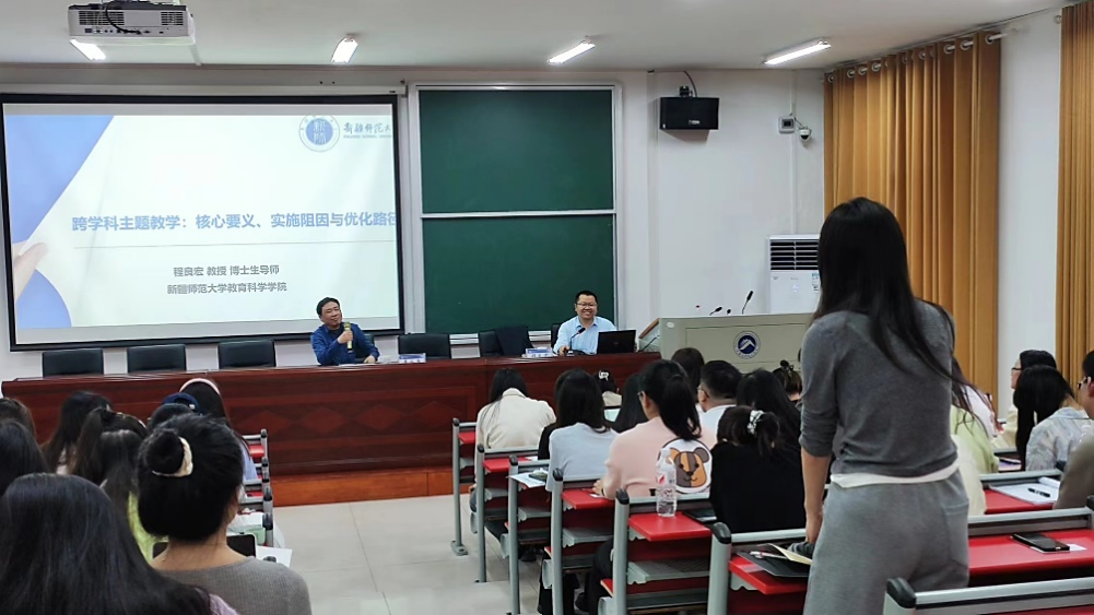 程教授不仅对问题进行详细的梳理与解答,让我们知道“何谓”与“何为”的基本学理,同时使我们了解到跨学科主题教学有利于推进课程方案实践落地和优化实施。讲座中同学们积极发言,提出自己在教学实践中遇到的问题。程教授热情与同学交流互动,解答同学们提出的疑问。