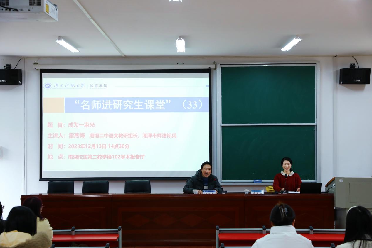 12月13日,“名师进研究生课堂”系列讲座第33讲在雨湖校区第二教学楼102报告厅举行,湘钢二中语文教师雷燕梅为公司师生带来“成为一束光”的主题讲座。2023级研究生到场聆听。球盟会夏永庚教授主持。