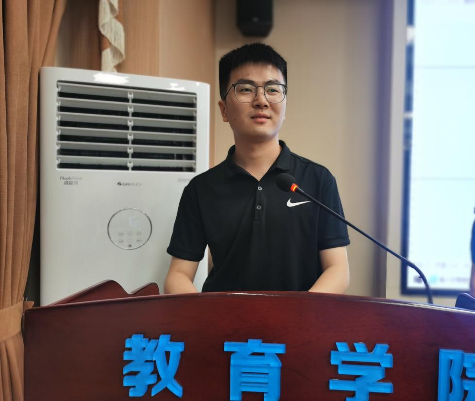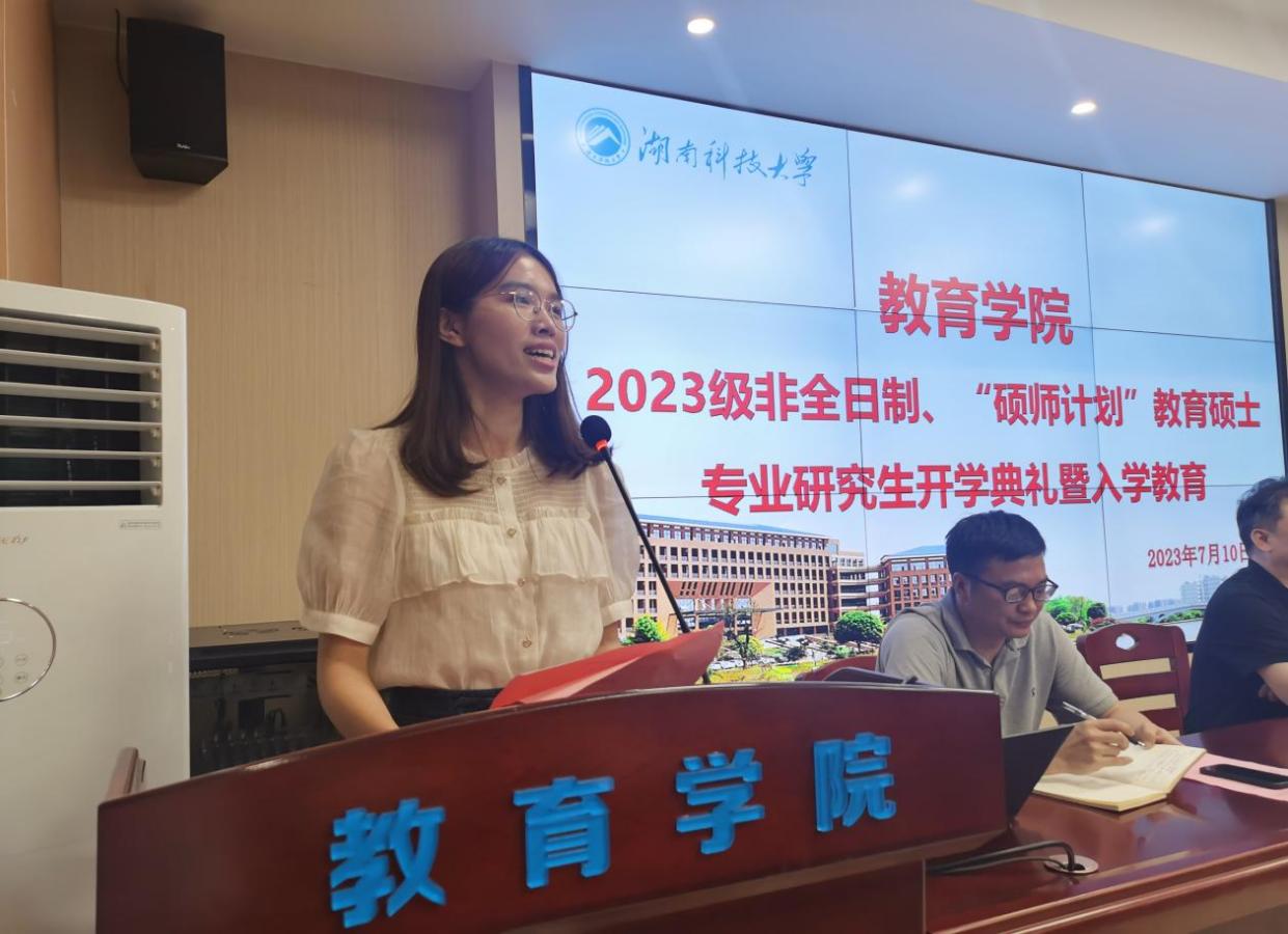 典礼第二项,2022级研究生朱怡锦同学作为老生代表发言。她首先代表高年级同学对师弟师妹们的到来表示欢迎。随后,她结合自身读研经历,从“热爱者”“担当者”“创新者”三个角度鼓励并提醒大家热爱教育事业、担当教育责任、创新教育方法。
