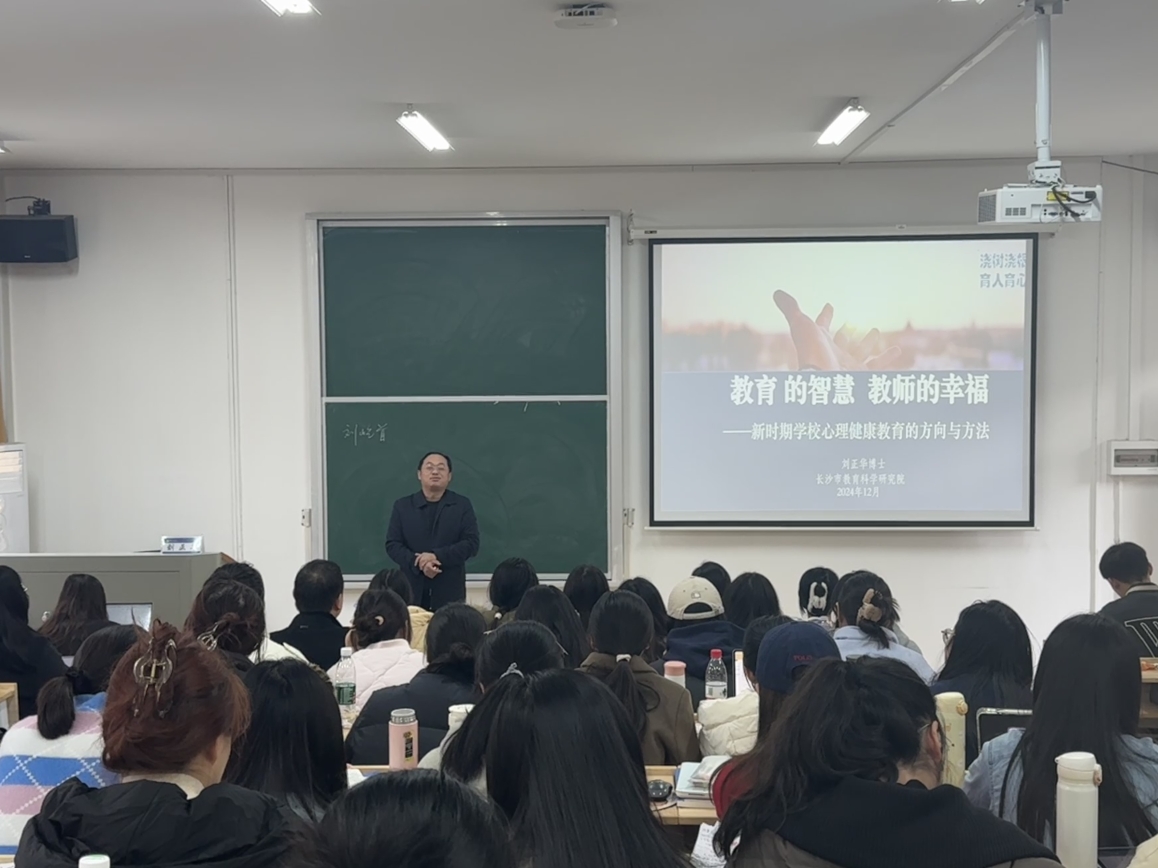 12月18日下午,“名师进研究生课堂”系列讲座第36讲在雨湖校区第二教学楼101教室举行。高级教师,教育博士,长沙市教科院决策研究中心理论教研员刘正华老师为公司师生带来:“教育的智慧,教师的幸福——新时期公司心理健康教育的方向和方法”的主题讲座。公司2024级教育硕士到场聆听,讲座由心理健康教育专业领域导师欧阳益主持。