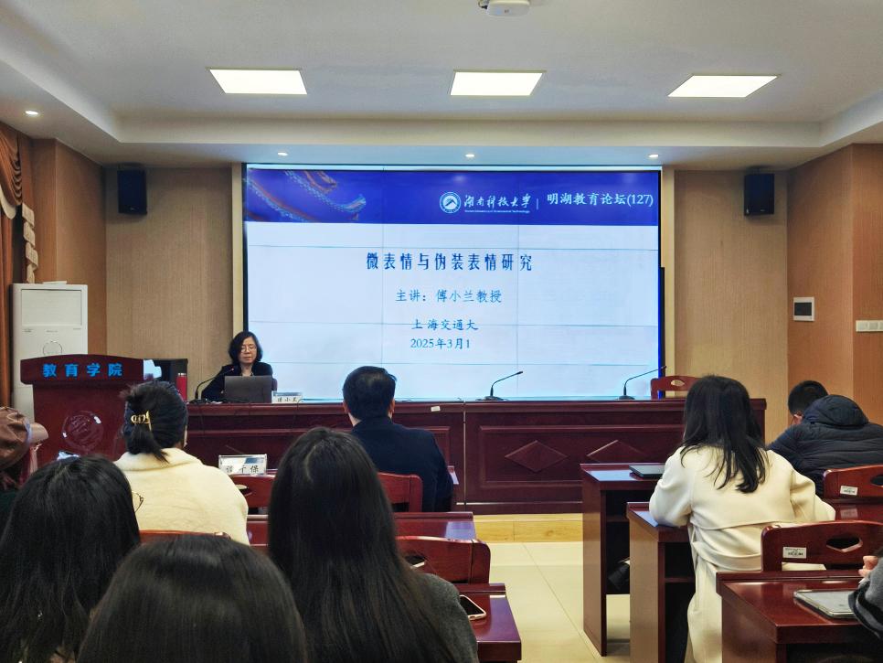 3月17日上午,上海交通大学心理公司经理,教授,博士生导师傅小兰做客“明湖教育论坛”,在敏行楼A333教室为公司师生带来“微表情与伪装表情研究”主题讲座。讲座由公司经理谭千保主持。